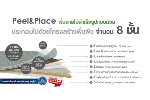 Peel & Place Collection จึงเป็น “พื้น” เพื่อสุขภาพที่เหนือกว่า ด้วยนวัตกรรมใหม่ที่มีระบบ Vacuum Technology จากญี่ปุ่น ที่ติดตั้งง่ายด้วยระบบสุญญากาศ ไม่ต้องใช้กาว ไม่ต้องรื้อพื้นแค่ลอกและปูทับได้ทุกพื้นผิว มาพร้อมเทคโนโลยีสมาร์ทเลเยอร์มาตรฐานยุโรป (European Standard) มีความปลอดภัย กันลื่นในระดับ R10 แต่ยังคงความแข็งแรงทนทาน ที่มาพร้อมความยืดหยุ่นพิเศษในรูปแบบม้วนสำเร็จช่วยให้สามารถปูเสร็จได้ภายใน 1 วัน โดยปราศจากฝุ่น ไร้กลิ่น ช่วยลดมลพิษได้ทางหนึ่ง และสามารถเข้าอยู่ได้ทันที อีกทั้งยังเติมเต็มด้วยความสวยของลายไม้ ที่คัดสรรลวดลายแบบ Exclusive มีเอกลักษณ์เฉพาะตัว มีความเสมือนไม้จริงทุกองศา มีความนูนต่ำเหมือนผิวไม้ ให้ความรู้สึกอบอุ่นสัมผัสได้ถึงความเป็นธรรมชาติอย่างแท้จริง ทั้งยังป้องกันน้ำได้ถึง 100% รวมถึงป้องกันปลวกและแมลงทุกชนิดด้วย”