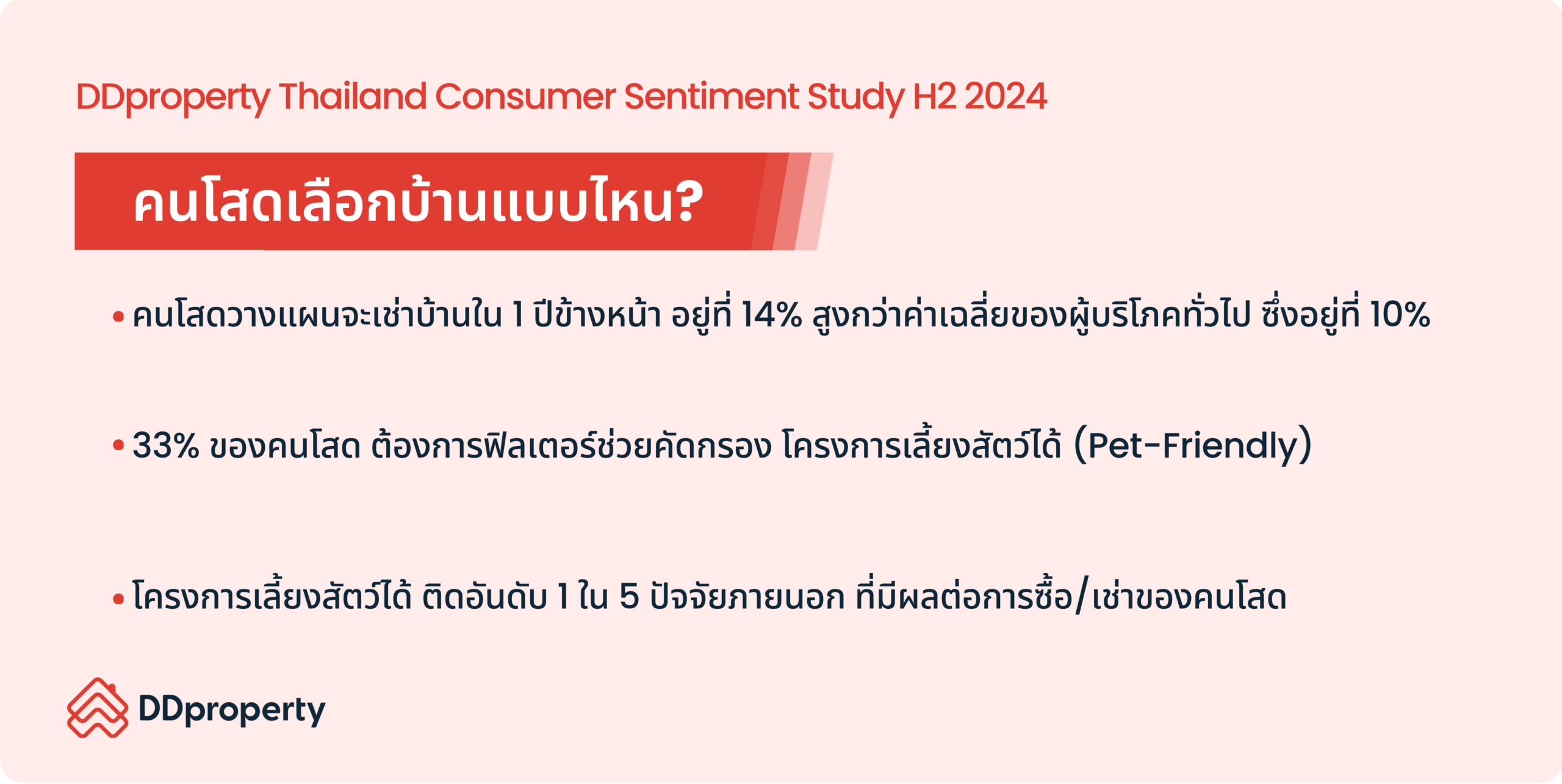 สอดคล้องกับแบบสอบถามฯ DDproperty Thailand Consumer Sentiment Study พบว่า 33% ของคนโสดต้องการฟิลเตอร์ช่วยคัดกรองโครงการเลี้ยงสัตว์ได้ (Pet-Friendly) เมื่อค้นหาที่อยู่อาศัยออนไลน์ ซึ่งจะช่วยให้สามารถค้นหาที่อยู่อาศัยที่ออกแบบเพื่อรองรับการอยู่อาศัยของสัตวเลี้ยงโดยเฉพาะ และได้อยู่ท่ามกลางคอมมูนิตี้ของคนรักสัตว์เหมือนกัน ซึ่งส่งผลต่อความเป็นอยู่ที่ดีในระยะยาว นอกจากนี้ โครงการเลี้ยงสัตว์ได้ (Pet-Friendly) ยังติดอันดับ 1 ใน 5 ปัจจัยภายนอกโครงการที่มีผลต่อการตัดสินใจเลือกซื้อ/เช่าที่อยู่อาศัยของคนโสดอีกด้วย