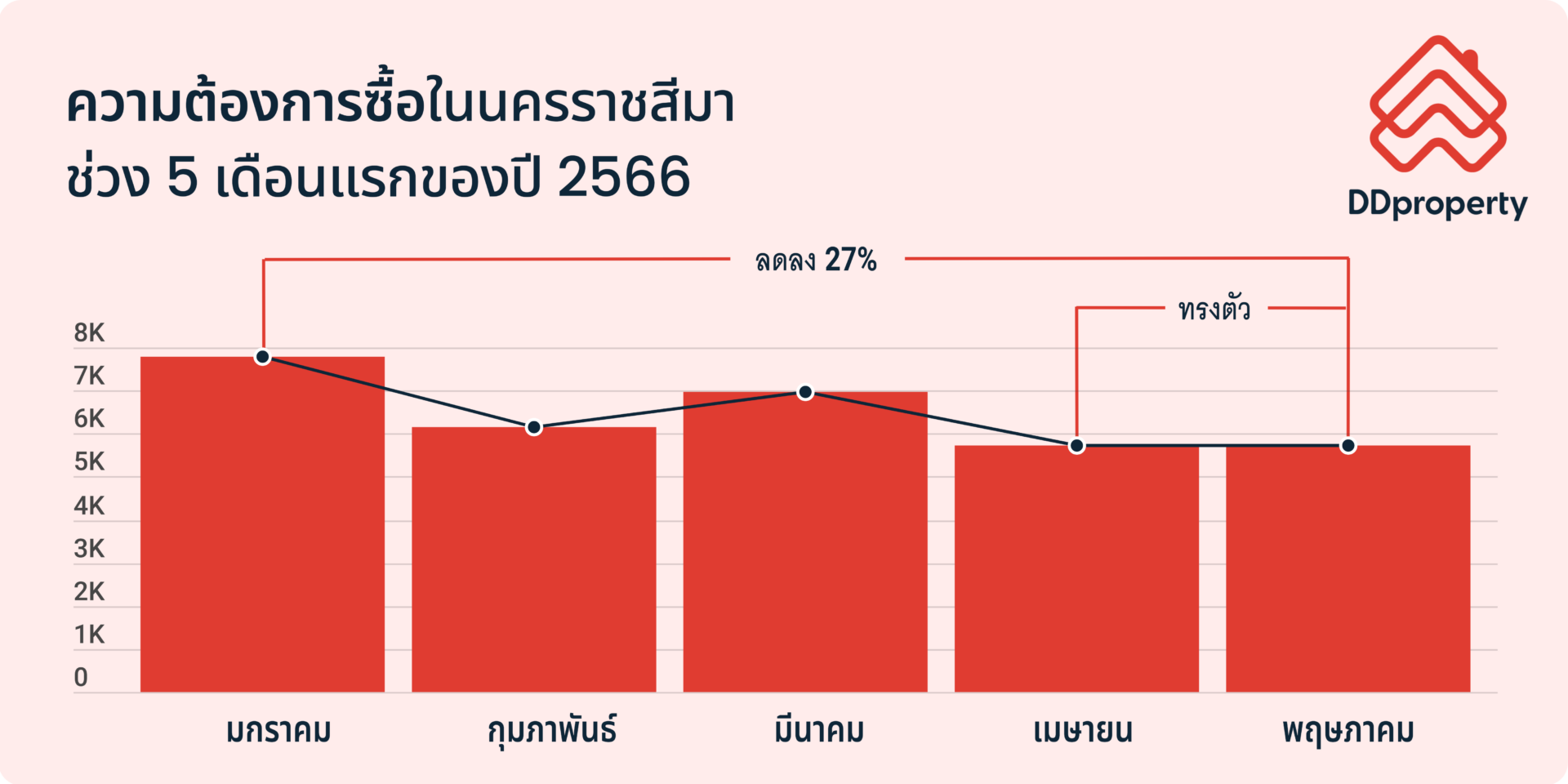 ขณะที่ภาพรวมความต้องการซื้อที่อยู่อาศัยในช่วง 5 เดือนแรกของปี 2566 นั้นลดลง 27% จากเดือนมกราคม และปรับตัวลดลงในทุกประเภทที่อยู่อาศัย โดยทาวน์เฮ้าส์ลดลงมากที่สุดถึง 55% จากเดือนมกราคม ตามมาด้วยบ้านเดี่ยว และคอนโดฯ (ลดลง 28% และลดลง 11% จากเดือนมกราคม ตามลำดับ)