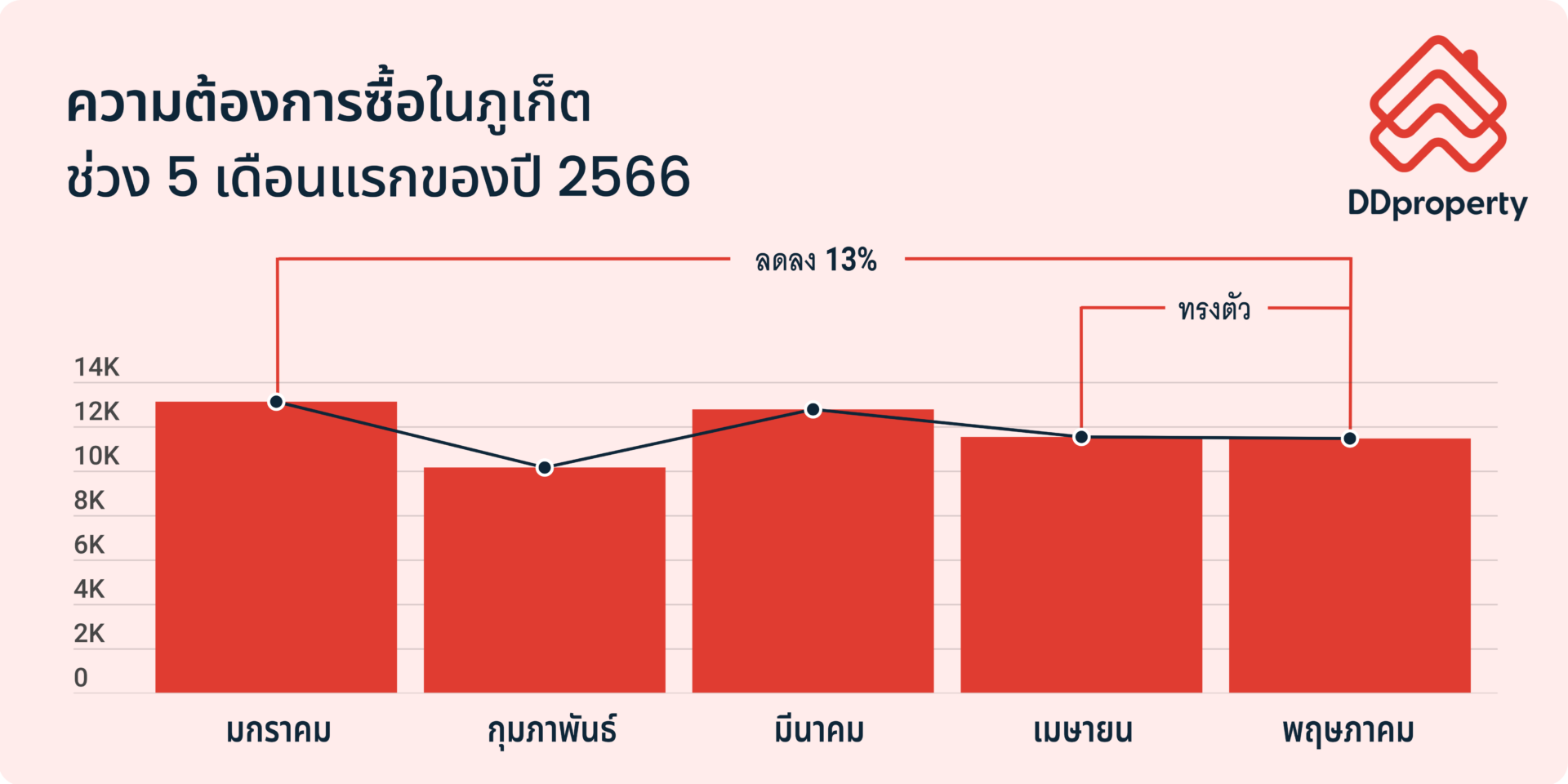ตลาดที่อยู่อาศัยของภูเก็ตในเดือนพฤษภาคมยังคงทรงตัวจากเดือนก่อนหน้า เมื่อพิจารณาภาพรวมความต้องการซื้อที่อยู่อาศัยในช่วง 5 เดือนแรกของปี 2566 พบว่า ลดลง 13% จากเดือนมกราคม