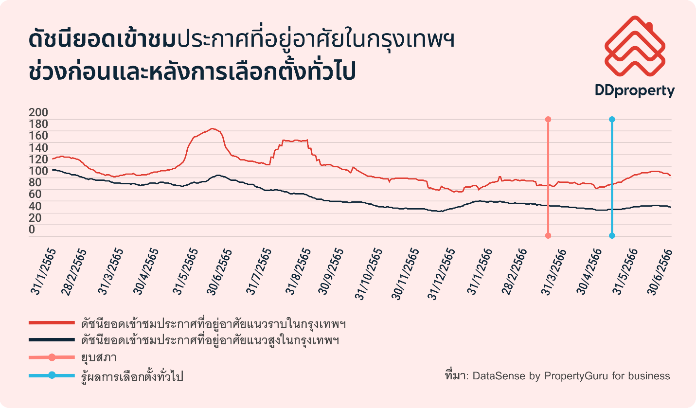 หลังจากการประกาศผลการเลือกตั้งทั่วไปของไทยเมื่อวันที่ 14 พฤษภาคม 2566 ความสนใจในอสังหาริมทรัพย์ได้กลับมาอีกครั้ง โดยมีหลักฐานชี้ชัดว่าดัชนียอดเข้าชมประกาศที่อยู่อาศัยของไทยได้ปรับตัวเพิ่มขึ้นเข้าสู่ระดับสมดุลใหม่ ซึ่งการฟื้นตัวของดีมานด์ในลักษณะนี้สะท้อนให้เห็นถึงความมั่นใจของผู้บริโภคที่มีต่อภาพรวมเศรษฐกิจในระยะยาว เนื่องจากการซื้ออสังหาฯ นั้นถือเป็นการลงทุนระยะยาวกว่าการลงทุนในตลาดหุ้น