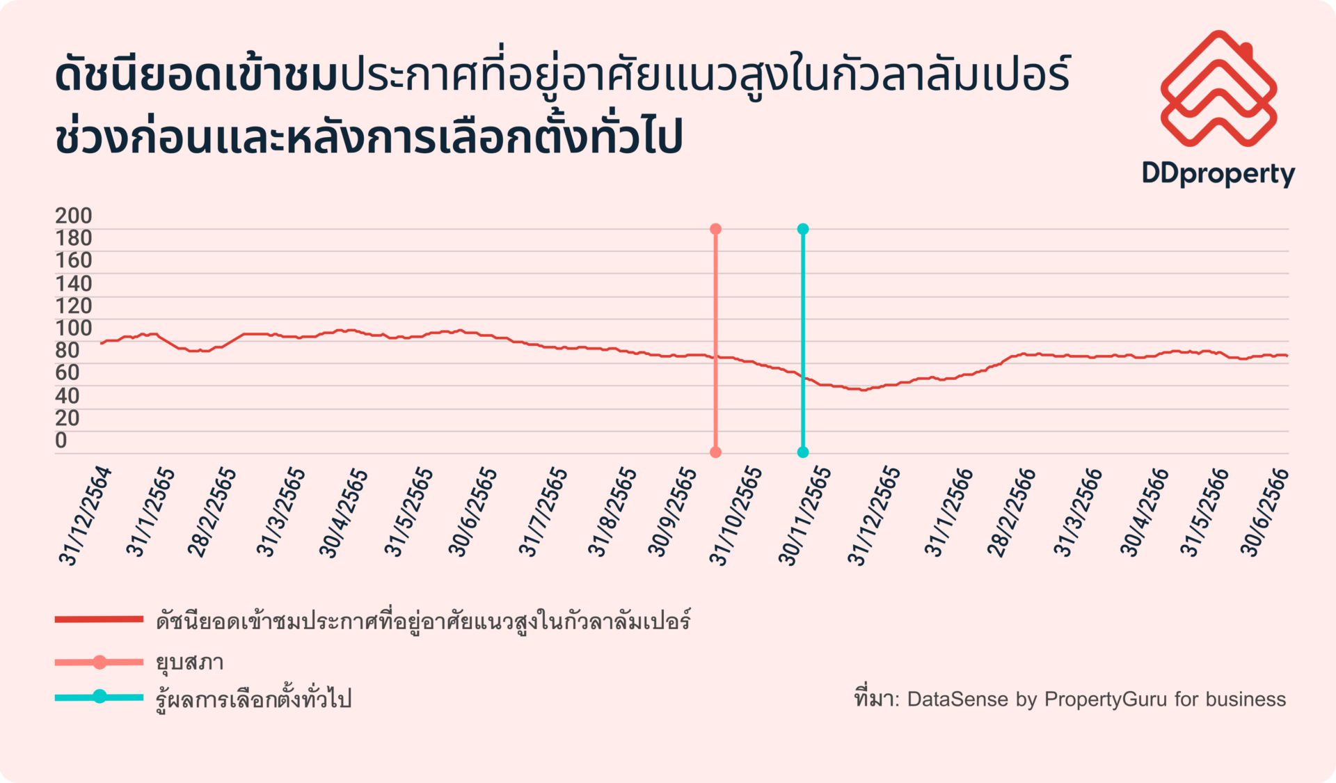 ดร.ลี ไนเจีย หัวหน้าฝ่ายวิเคราะห์ตลาดอสังหาริมทรัพย์ ของหน่วยธุรกิจดาต้า แอนด์ ซอฟต์แวร์ โซลูชั่น (DSS) ของพร็อพเพอร์ตี้กูรู กรุ๊ป ให้ความเห็นเกี่ยวกับแนวโน้มของการซื้อบ้านของผู้บริโภคไทยในช่วงการเลือกตั้งทั่วไปที่ผ่านมานี้ว่า “เราสังเกตเห็นแนวโน้มที่คล้ายคลึงกันในเมืองไทยในช่วงหลังการเลือกตั้งที่ผ่านมา หลังจากที่เราได้คำนวณตัวเลขดัชนี ซึ่งคิดจากยอดผู้เข้าชมประกาศบนเว็บไซต์ DDproperty.com เป็นรายวัน โดยใช้ค่าเฉลี่ยเคลื่อนที่ (Moving Average) ในช่วง 30 วันเป็นตัวควบคุมข้อมูลที่เปลี่ยนแปลงไปในแต่ละวันของช่วงเวลาดังกล่าว และนับวันเริ่มต้น (Base Date) จากวันที่ 1 มกราคม 2565 อย่างไรก็ดี ภายหลังการประกาศยุบสภาเมื่อวันที่ 20 มีนาคม 2566 กลับเห็นสัญญาณของยอดเข้าชมประกาศบนเว็บไซต์ที่เพิ่มขึ้น และยังคงอยู่ในระดับที่ทรงตัวในเวลาต่อมา