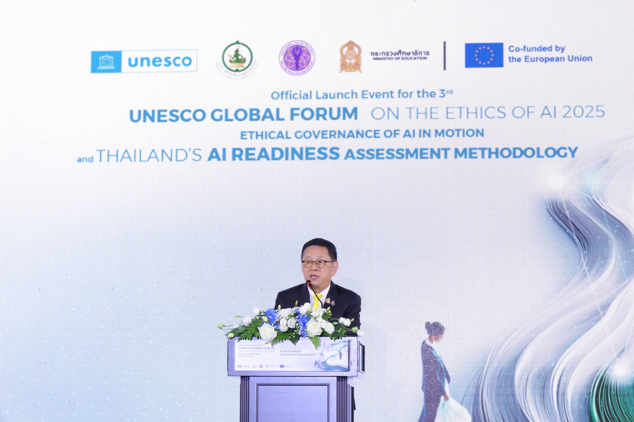 ขณะที่ นายซิง ฉวี่ รองผู้อำนวยการใหญ่ UNESCO ได้กล่าวชื่นชมประเทศไทยในความเป็นผู้นำด้านการส่งเสริมธรรมาภิบาลจริยธรรม AI และการผลักดันความร่วมมือระดับนานาชาติ พร้อมเน้นย้ำว่าภารกิจของยูเนสโก ในการสร้างสันติภาพผ่านการศึกษา วิทยาศาสตร์ และวัฒนธรรม มีความสำคัญมากยิ่งขึ้นในยุคที่ AI เข้ามามีบทบาทสำคัญในการเปลี่ยนแปลงสังคม เศรษฐกิจ และชีวิตของผู้คน พร้อมยังกล่าวถึงการเติบโตอย่างรวดเร็วของเศรษฐกิจดิจิทัลในภูมิภาคเอเชียตะวันออกเฉียงใต้ ที่มาพร้อมกับความก้าวหน้าในโครงสร้างพื้นฐาน AI ของภูมิภาค จนอาจนำมาสู่ความท้าทายที่เกิดขึ้น เช่น ความเหลื่อมล้ำทางดิจิทัล และผลกระทบต่อการจ้างงานจากระบบอัตโนมัติอย่าง AI เป็นต้น