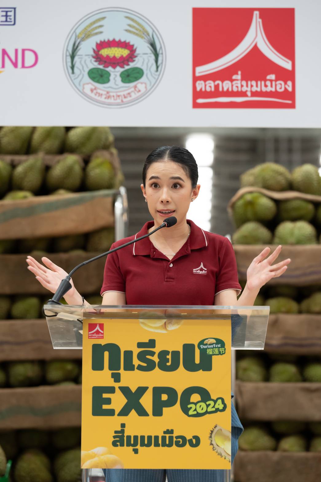 คุณภาสกร บุญญลักษม์ ผู้ว่าราชการจังหวัดปทุมธานี กล่าวว่า งานทุเรียน EXPO สี่มุมเมือง 2024 ถือเป็นจุดเริ่มต้นที่ดีของการท่องเที่ยวแบบ One day trip ช้อป กิน เที่ยว ซึ่งเป็นหนึ่งในนโยบายส่งเสริมด้านเศรษฐกิจของจังหวัดปทุมธานีที่เชื่อมโยงกับการท่องเที่ยว ชุมชน การตลาดสินค้า และบริการท้องถิ่น เพื่อสร้างโอกาสทางเศรษฐกิจที่ยั่งยืนในระยะยาว แม้ว่าจังหวัดปทุมธานีจะไม่ได้เป็นแหล่งปลูกทุเรียนหลัก แต่เรามีตลาดสี่มุมเมือง ซึ่งเป็นศูนย์กลางค้าส่ง-ปลีกผักผลไม้ ที่ใหญ่ที่สุดระดับอาเซียน และเป็นแหล่งกระจายสินค้าการเกษตรทุกชนิดไปทั่วประเทศ รวมถึงทุเรียน ที่แหล่งปลูกทุเรียนจากจังหวัดต่างๆ ที่ส่งผลผลิตเข้ามาจำหน่ายที่งานทุเรียน EXPO สี่มุมเมือง 2024 มากถึงวันละ 100,000 ลูก