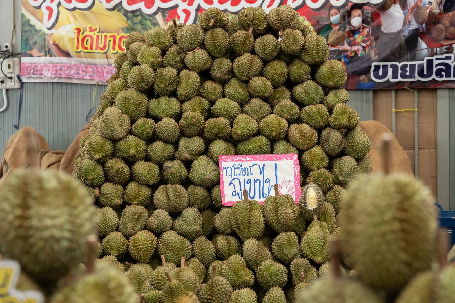 พร้อมให้ทุกคนจุใจกับการเลือกซื้อทุเรียน ทั้งกองทัพรถทุเรียนสดส่งตรงจากสวน และแผงค้าที่ยกภูเขาทุเรียน มาจำหน่ายที่งานให้เลือกซื้อมากถึง 100,000 ลูก มีทั้งสายพันธุ์ยอดนิยม ก้านยาว หมอนทอง ชะนี พวงมณี นกกระจิบ กระดุม และสายพันธุ์หาทานยาก ป่าละอู หลงลับแล-หลินลับแล ภูเขาไฟศรีสะเกษ ย่ำมะหวาด ทองลินจง จันทบุรี กบสุวรรณ เป็นต้น ทั้งขายส่งเพื่อพ่อค้าแม่ค้ารับไปขายต่อ และขายปลีกสำหรับคนรักทุเรียนที่ต้องการซื้อกลับบ้าน สามารถเข้ามาซื้อได้ทุกวันตลอด 24 ชั่วโมง