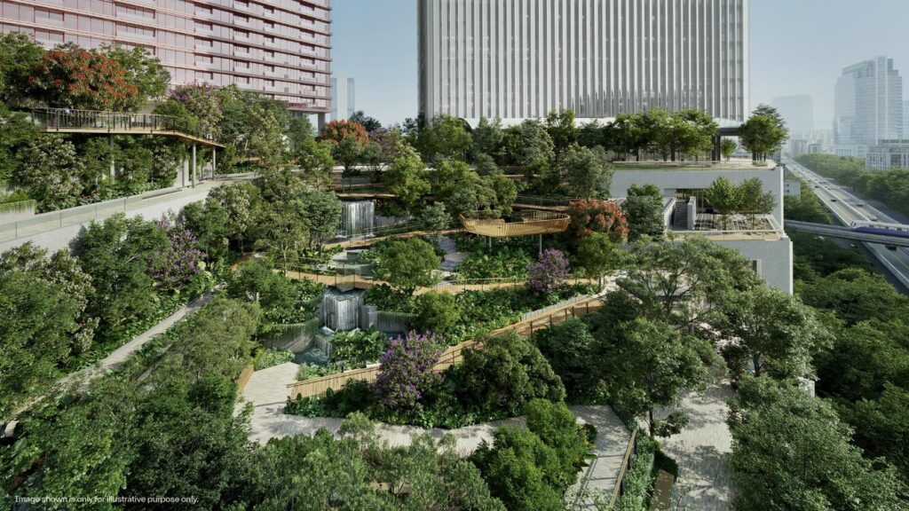 นอกจากนี้ การดีไซน์พื้นที่ยังได้คำนึงถึงมาตรฐานการรับรอง LEED ซึ่งเป็นมาตรฐานของอาคารสีเขียว โดยการใช้วัสดุธรรมชาติที่ทดแทนได้ อาทิ การสร้างทางเดินลาดด้วยไม้ที่เป็นวัสดุธรรมชาติที่มีความทนทานและสามารถทดแทนได้ และยังสร้างประสบการณ์ให้ผู้ใช้รู้สึกอบอุ่นเหมือนได้สัมผัสธรรมชาติจริง ๆ การใช้หินในบางพื้นที่ และใช้วัสดุทดแทน อย่างกรวดและทรายขัดล้างแทนที่ซีเมนต์เบส เพื่อให้ได้สีสันความสวยงามตามธรรมชาติและทำให้พื้นผิวมีความน่าสนใจ และอีกหนึ่งสิ่งที่สำคัญ คือ งานโครงสร้าง โดยเราได้ร่วมทำงานกับ Structure Engineer ที่ได้ออกแบบและวางรูปแบบโครงสร้างที่มีความซับซ้อนสูง เพื่อรองรับแพลตฟอร์มของอาคารทั้ง 4 องค์ประกอบ ทั้งโรงแรม ที่พักอาศัย ศูนย์การค้า และสำนักงาน ที่มีลักษณะและรูปแบบที่แตกต่างกัน เรามีการขึ้นโครงสร้างและคานของสวนในทุกขั้นตอนในเชิงสามมิติ ครบทุกโซน ทุกรายละเอียด เพื่อให้ง่ายต่อการ Joint ทุกชิ้นส่วนเข้าด้วยกัน สร้างความแข็งแรงให้โครงสร้างสามารถรองรับน้ำหนักได้มากและไม่รั่วซึม ทำให้พื้นที่ด้านบนสามารถรองรับได้ทั้งต้นไม้ขนาดใหญ่ น้ำตก และพื้นที่กิจกรรมต่างๆ”