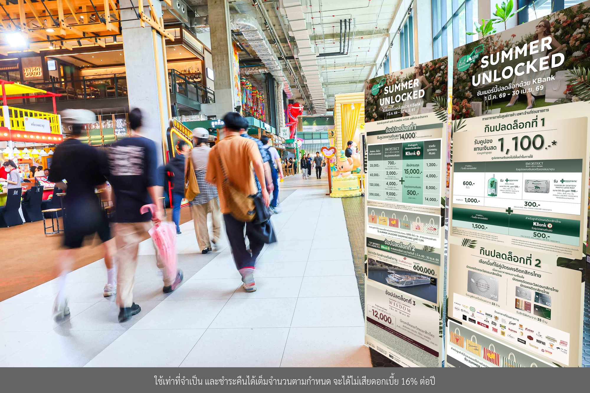 แคมเปญ Summer Unlocked ลูกค้าที่ใช้จ่ายผ่านบัตรเครดิตกสิกรไทย ในศูนย์การค้าครบตามเงื่อนไง สามารถรับคูปองแทนเงินสดตามระดับยอดใช้จ่าย โดยมูลค่าสูงสุดอยู่ที่ 14,000 บาท และพิเศษเฉพาะบัตรเครดิตเดอะวิสดอมกสิกรไทย ช้อบครบ 300,000 บาท รับคูปองแทนเงินสด สูงสุด 12,000 บาท และสำหรับลูกค้าที่มียอดสะสม 3,000 บาทต่อ 1 บัตรเครดิต รับของสมนาคุณ “SUMMER UNLOCK SHOPPING BAG” มูลค่า 1,290 บาท และโปรฯแรงไม่หยุดช่วงเวลาพิเศษฉลองซัมเมอร์วันที่ 1- 4 เมษายน 2569 ช้อป 1,000 รับคูปองแทนเงินสดมูลค่า 1,000 บาท (ตามเงื่อนไข)