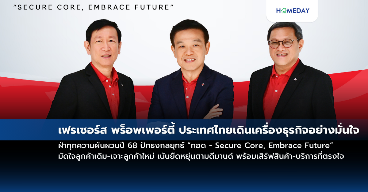เฟรเซอร์ส พร็อพเพอร์ตี้ ประเทศไทย เปิดแผนธุรกิจปี 68 ชูกลยุทธ์ “กอด – Secure Core, Embrace Future” กอด ลูกค้าให้มั่น จับมือกันให้แน่น โฟกัสการดำเนินงาน 3 มิติ Flexible-Feeling-Focus ขับเคลื่อนอสังหาริมทรัพย์เพื่อการอยู่อาศัย-อุตสาหกรรม-พาณิชยกรรมเติบโตมั่นคงท่ามกลางความผันผวนทางเศรษฐกิจ พร้อมดึง AI ยกระดับการทำงานไปอีกขั้น เสริมความแข็งแกร่งเป็นแพลตฟอร์มอสังหาริมทรัพย์ครบวงจร ด้วยเป้าหมายเป็น Real Estate as a Service Brand