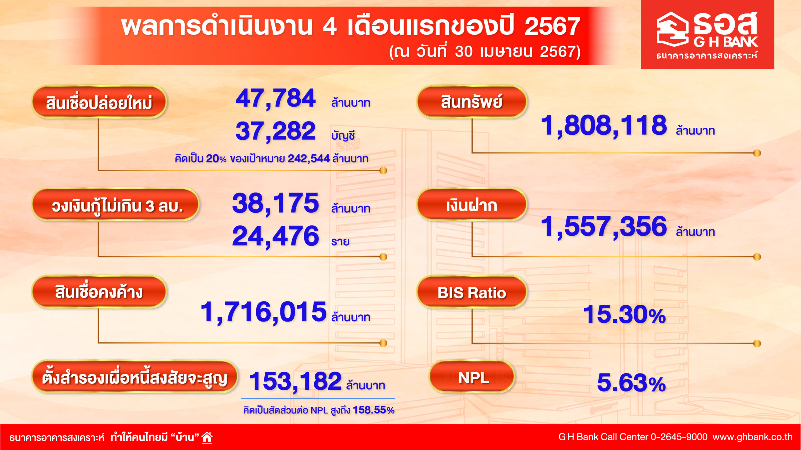 ธอส. เผยผลการดำเนินงาน 4 เดือนแรกของปี 2567 ปล่อยสินเชื่อใหม่ได้ 47,784 ล้านบาท คิดเป็น 20% ของเป้าหมายที่ตั้งไว้ - Homeday Space | HOMEDAY