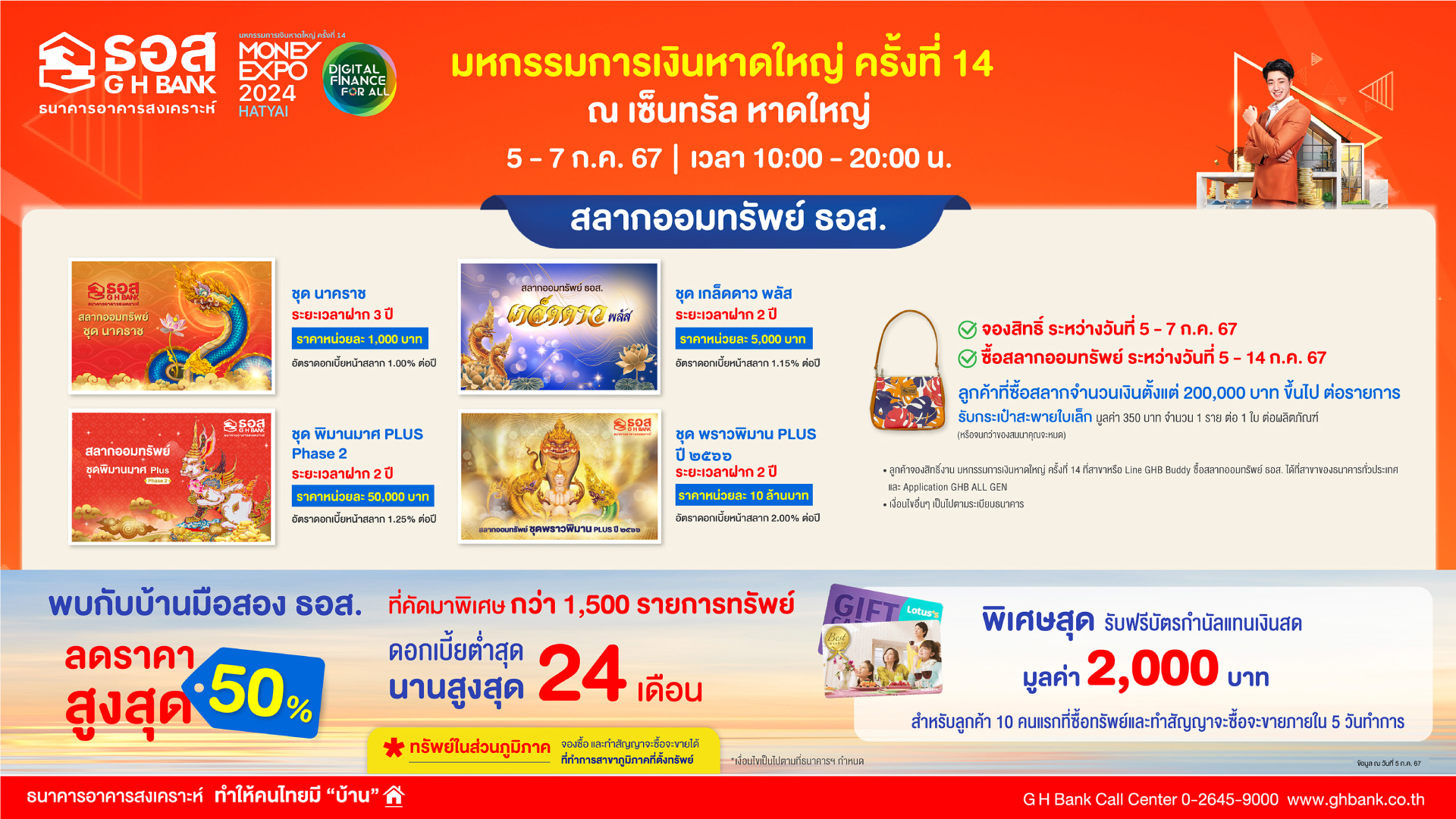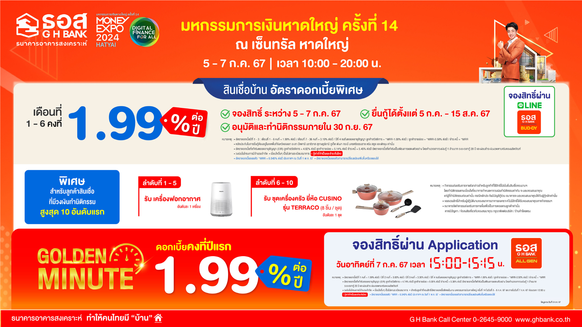 (1) สินเชื่อบ้านอัตราดอกเบี้ยพิเศษ อัตราดอกเบี้ยเดือนที่ 1 – 6 เท่ากับ 1.99% ต่อปี, เดือนที่ 7 – 36 เท่ากับ 3.19% ต่อปี (อัตราดอกเบี้ยเฉลี่ย 3 ปีแรกเท่ากับ 2.99% เท่านั้น) และปีที่ 4 จนถึงตลอดอายุสัญญา กรณีลูกค้าสวัสดิการ เท่ากับ MRR-1.00% ต่อปี, ลูกค้ารายย่อย เท่ากับ MRR-0.50% ต่อปี และการกู้ชำระหนี้เกี่ยวกับที่อยู่อาศัย เท่ากับ MRR (อัตราดอกเบี้ย MRR ธอส. ปัจจุบัน เท่ากับ 6.545% ต่อปี) ผ่อนชำระนานสูงสุดถึง 40 ปี ให้กู้ครอบคลุมทุกวัตถุประสงค์หลัก อาทิ ซื้อบ้าน/คอนโดมิเนียม ปลูกสร้าง ต่อเติม ซ่อมแซม รีไฟแนนซ์ และชำระหนี้เกี่ยวกับที่อยู่อาศัย (หลักประกันในการยื่นกู้ต้องอยู่ในเขตพื้นที่จังหวัดในภาคใต้ตอนล่าง และภาคตะวันตก) โดยสามารถจองสิทธิ์ผ่าน Line GHB Buddy ยื่นคำขอกู้ได้ตั้งแต่วันที่ 5 กรกฎาคม – 15 สิงหาคม 2567 และทำนิติกรรม ภายในวันที่ 30 กันยายน 2567 โดยผู้กู้จะได้สิทธิ์ค่าประเมินราคาหลักประกันอัตราพิเศษอีกด้วย และพิเศษสุดสำหรับลูกค้าภายในงานเท่านั้น!! ช่วง Golden Minute อัตราดอกเบี้ยต่ำ โดยเปิดจองสิทธิ์ผ่าน Mobile Application : GHB ALL GEN ในวันอาทิตย์ที่ 7 กรกฎาคม 2567 ระหว่างเวลา 15.00 – 15.15 น. จองก่อนได้ก่อน กรอบวงเงินจำกัดและเงื่อนไขตามที่ธนาคารกำหนด พิเศษ! สำหรับลูกค้าที่มีวงเงินทำนิติกรรมสูงสุด 10 อันดับแรก รับของสมนาคุณฟรีมากมาย!! โดยลำดับที่ 1 – 5 รับเครื่องฟอกอากาศ 1 เครื่อง (อันดับละ 1 สิทธิ์), ลำดับที่ 6 – 10 รับชุดเครื่องครัว ยี่ห้อ CUSINO รุ่น TERRACO (8 ชิ้น/ชุด) จำนวน 1 ชุด (ลำดับละ 1 สิทธิ์)