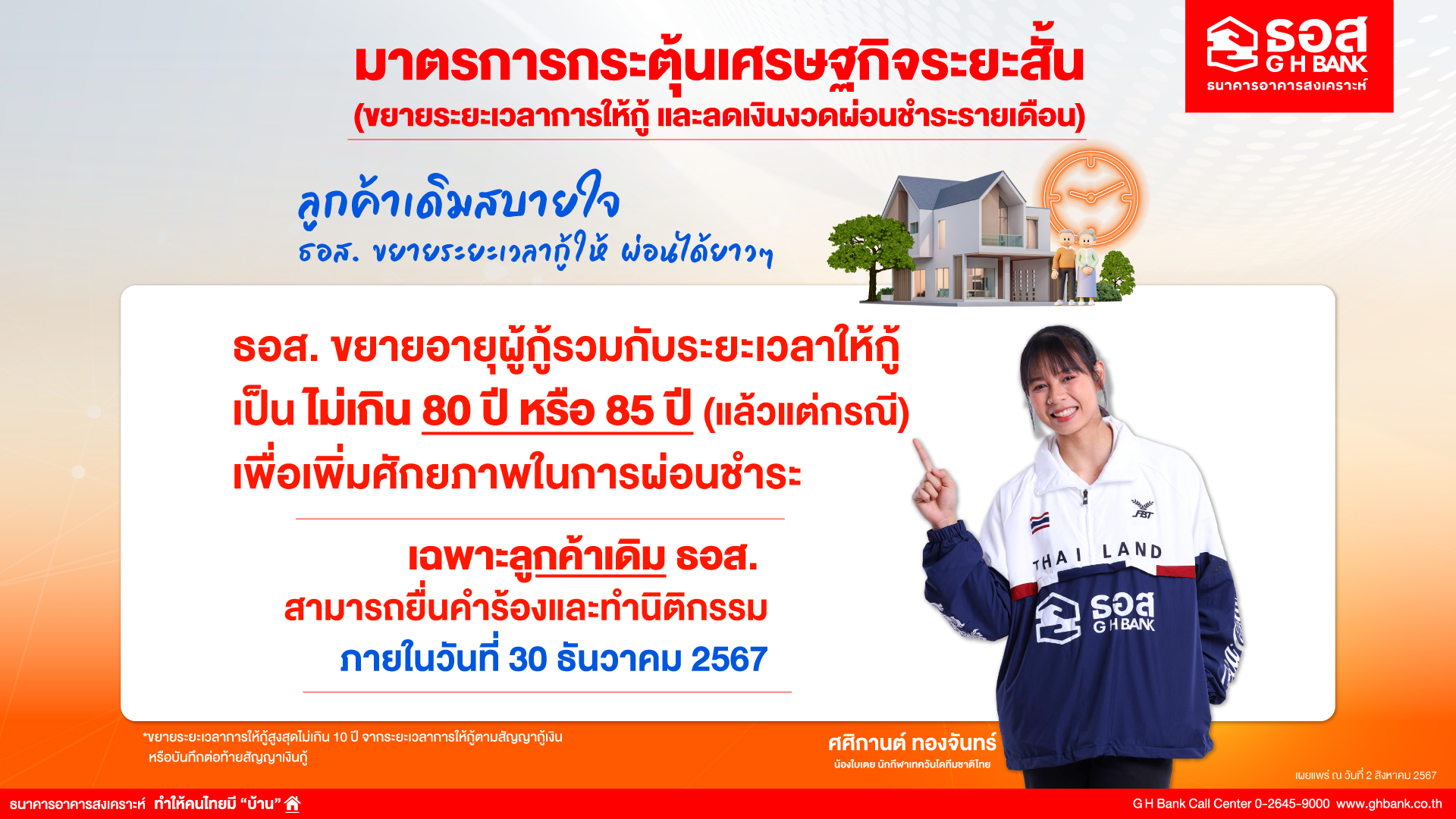 ธนาคารอาคารสงเคราะห์ (ธอส.) เพิ่มโอกาสให้คนไทยมีบ้านเป็นของตนเอง จัด “งานประมูลบ้านมือสองออนไลน์ : GHB’s NPA Online Auction 2024” วันที่ 15 พฤศจิกายน 2567 เวลา 12.00 – 12.30 น. ผ่าน Application : GHB ALL HOME พบทรัพย์เด่น ทำเลดี ราคาสุดคุ้มมากกว่า 1,300 รายการทั่วประเทศ พร้อมส่วนลดสูงถึง 35% จากราคา