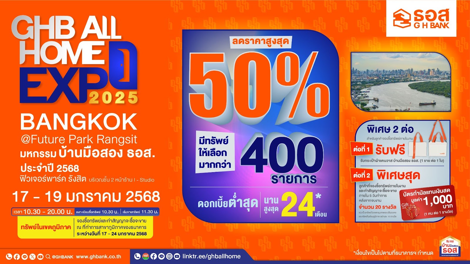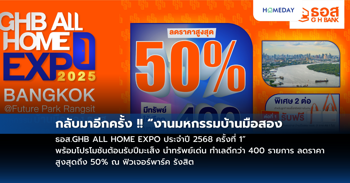 ธนาคารอาคารสงเคราะห์ (ธอส.) จัด “งานมหกรรมบ้านมือสอง GHB ALL HOME EXPO ประจำปี 2568 ครั้งที่ 1” นำทรัพย์เด่น ทำเลดี ราคาสุดคุ้มมากกว่า 400 รายการทั่วป