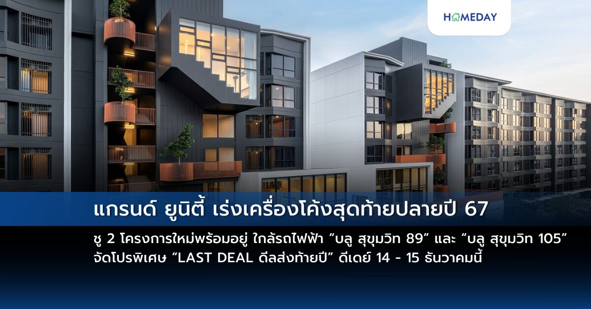 แกรนด์ ยูนิตี้ เดินหน้าอัดโปรฯ กระตุ้นยอดขาย ช่วงชิงกำลังซื้อโค้งสุดท้ายปลายปี 67 อย่างต่อเนื่อง นำ 2 โครงการใหม่พร้อมอยู่ บนทำเลศักยภาพ ใกล้รถไฟฟ้า จากแบรนด์ “บลู (blue)” ได้แก่ โครงการ “บลู สุขุมวิท 89” และโครงการ “บลู สุขุมวิท 105” จัดโปรพิเศษ “LAST DEAL ดีลส่งท้ายปี” พร้อมรับทองคำทุกยูนิต* ฟรี เฟอร์นิเจอร์* และเครื่องใช้ไฟฟ้า* ในวันที่ 14 – 15 ธันวาคมนี้ เท่านั้น
