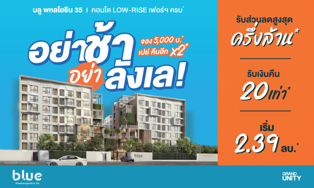 ห้ามพลาด! อย่าช้า อย่าลังเล พบกับโปรโมชั่น “ลดครึ่งล้าน เปย์คืน 2 ต่อ” ได้วันที่ 16 – 17 สิงหาคม 2568 ณ สำนักงานขายโครงการ บลู พหลโยธิน 35 สำหรับผู้ที่สนใจสามารถนัดเข้าชมโครงการด้วยตนเองได้ที่ www.grandunity.co.th หรือสอบถามรายละเอียดข้อมูลเพิ่มเติมได้ที่ LINE: @GrandUnity หรือ โทร. 0 2652 4000
