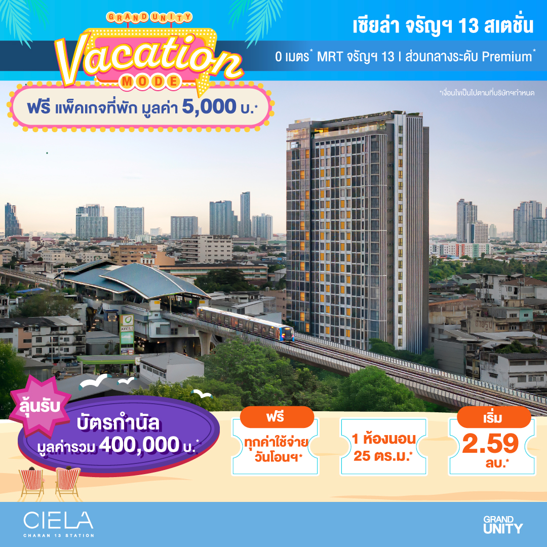 โครงการ เซียล่า จรัญฯ 13 สเตชั่น (CIELA Charan 13 Station) คอนโดมิเนียมพร้อมอยู่ ติด MRT สถานีจรัญฯ 13 ระยะ 0 เมตร* ส่วนกลางระดับพรีเมียม พร้อมรับแพ็คเกจที่พัก มูลค่า 5,000 บาท* ฟรี เครื่องใช้ไฟฟ้า* และฟรี ทุกค่าใช้จ่ายวันโอนฯ* 1 ห้องนอน ขนาด 25 ตร.ม. ในราคาเริ่มต้น 2.59 ล้านบาท*