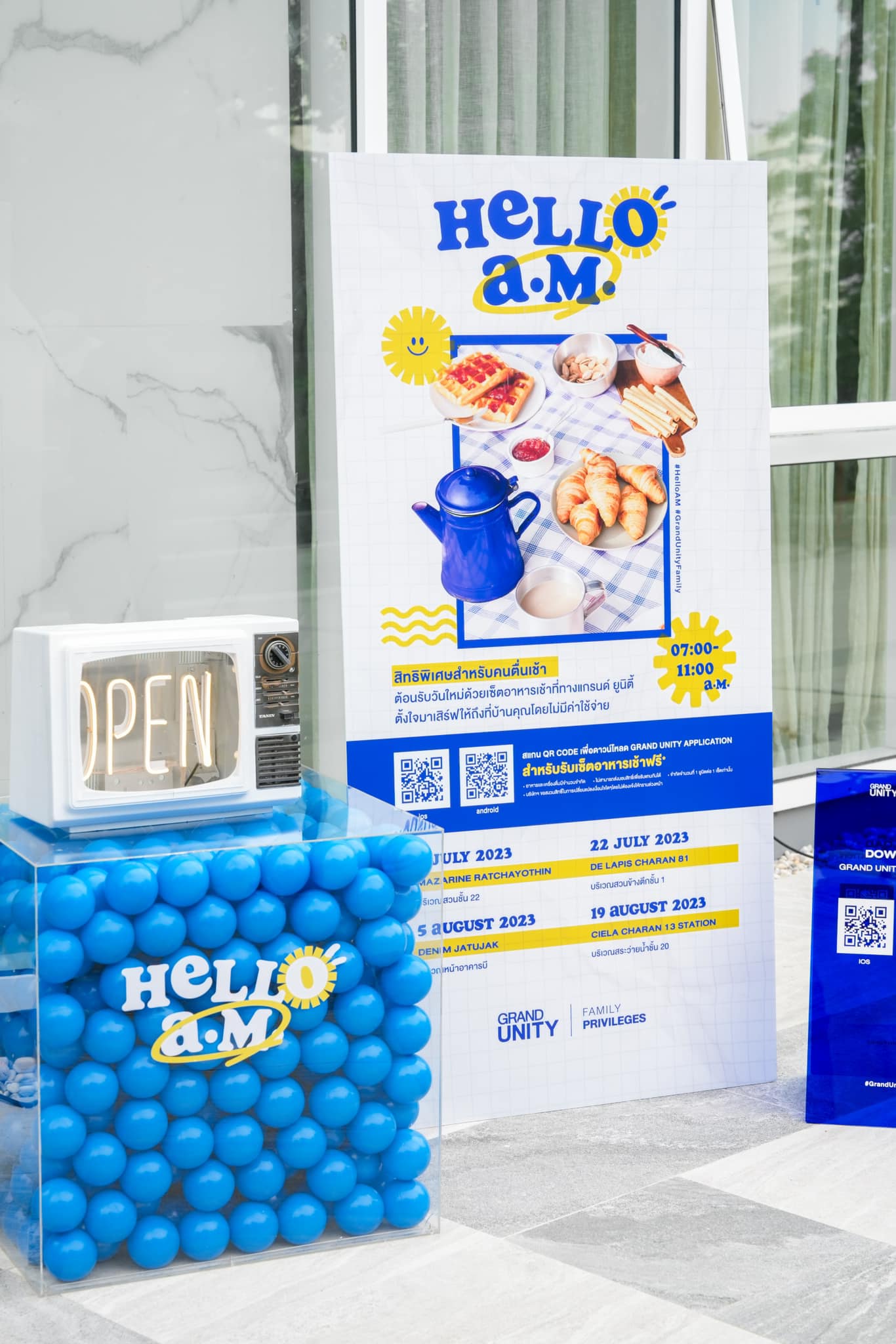 “สำหรับกิจกรรม Hello A.M. ถือเป็นกิจกรรมทักทายลูกบ้าน GRAND UNITY Family ในช่วงเช้าวันหยุด โดยรูปแบบกิจกรรมจะเป็นแบบ get together เพื่อให้ผู้อยู่อาศัยในโครงการได้เริ่มต้นเช้าวันหยุดอย่างมีคุณภาพ ด้วยสิทธิพิเศษบริการอาหารและเครื่องดื่มผ่านการรับสิทธ์ทาง Grand Unity Application ซึ่งในปีนี้เราได้เดินทางไปมอบประสบการณ์ความสุขให้กับสมาชิกครอบครัว GRAND UNITY Family จำนวน 4 โครงการ ได้แก่ โครงการ เดนิม จตุจักร, โครงการ เซียล่า จรัญฯ 13 สเตชั่น, โครงการ เดอ ลาพีส จรัญ 81 และโครงการแมสซารีน รัชโยธิน