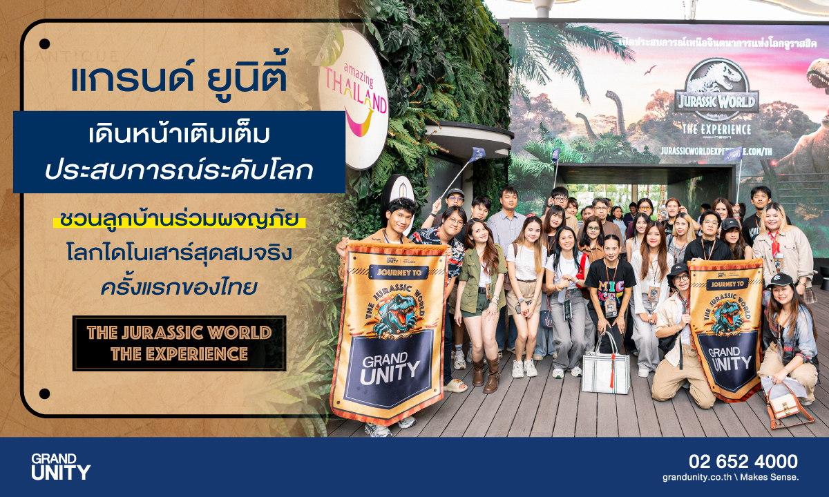 “สำหรับกิจกรรมล่าสุด บริษัทฯ ได้นำสมาชิกครอบครัว แกรนด์ ยูนิตี้ แฟมิลี่ ซึ่งเป็นผู้โชคดีจากการร่วมกิจกรรม “JOURNEY TO THE JURASSIC WORLD” ทางเฟสบุ๊กแฟนเพจ มาสัมผัสประสบการณ์สุดพิเศษกับนิทรรศกาลระดับโลกอย่าง “JURASSIC WORLD: THE EXPERIENCE” (จูราสสิค เวิลด์: ดิ เอ็กซ์พีเรียนซ์) โดยนับเป็นคนไทยกลุ่มแรกๆ ที่ได้ร่วมเดินทางเข้าสู่จักรวาลของภาพยนตร์แฟรนไชส์ระดับโลกอย่าง Jurassic World กับการย้อนยุคสู่โลกยุคดึกดำบรรพ์ ท่ามกลางฝูงไดโนเสาร์แอนิเมทรอนิกส์ (Animatronics) เสมือนจริง และตื่นตาตื่นใจไปกับความมหัศจรรย์เหนือจินตนาการที่เชื่อมโยงความบันเทิงกับการเรียนรู้อย่างยั่งยืน ณ เอเชียทีค เดอะ ริเวอร์ฟร้อนท์ เดสติเนชั่น พร้อมปิดท้ายด้วยดินเนอร์มื้อพิเศษที่ร้านอาหาร Fossil & Flame (ฟอสซิล แอ็นด์ เฟลม) ห้องอาหารภายใต้ธีมจูราสสิค เวิลด์ ที่มาพร้อมวิวแม่น้ำเจ้าพระยา จำลองบรรยากาศของเกาะอิสลา นูบลาร์ (Isla Nublar) อย่างในภาพยนตร์ สมาชิกครอบครัว แกรนด์ ยูนิตี้ ต่างเพลิดเพลินไปกับรสชาติและความคิดสร้างสรรค์ของเมนูที่ผสมผสานการเล่าเรื่องแบบภาพยนตร์ให้เข้ากับประสบการณ์การรับประทานอาหารได้อย่างลงตัว”