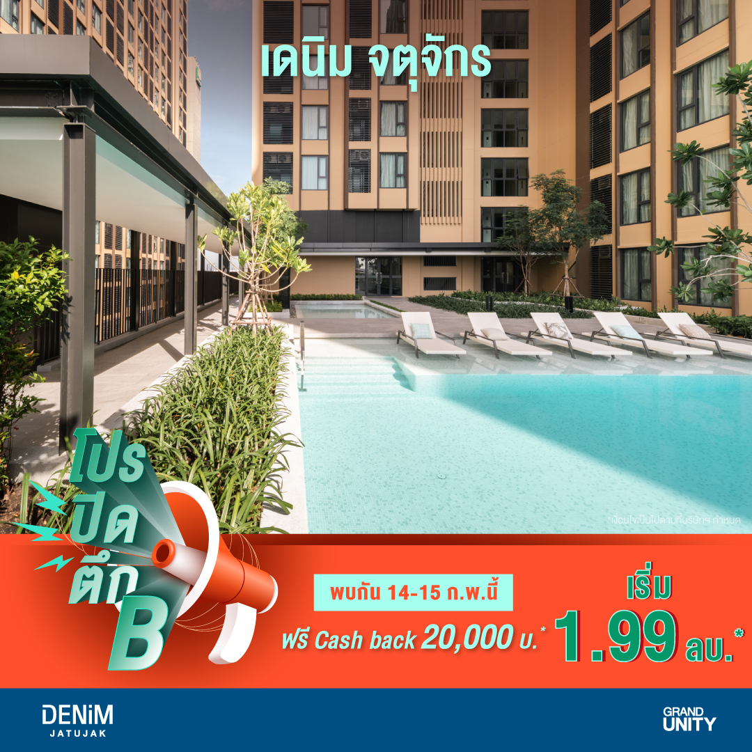 แกรนด์ ยูนิตี้ ตอกย้ำความสำเร็จโครงการ “เดนิม จตุจักร” (DENIM Jatujak) คอนโดมิเนียม ไลฟ์สไตล์ยุคใหม่ ใจกลางจตุจักร เพียง 5 นาที* ใกล้รถไฟฟ้า BTS สถานีหมอชิต และ MRT สถานีสวนจตุจักร เตรียมจัดโปรโมชั่นปิดตึก B ซึ่งเป็นอาคารที่ครบและดีที่สุด กับโอกาสสุดท้ายที่จะได้เป็นเจ้าของในราคาพิเศษ เริ่มต้นเพียง 1.99 ล้านบาท* พร้อมรับ Cashback มูลค่าสูงสุดถึง 20,000 บาท* และข้อเสนอสุดพิเศษมากมายเฉพาะในงานวันที่ 14 – 15 กุมภาพันธ์นี้ เพียง 20 ยูนิตสุดท้าย เท่านั้น!