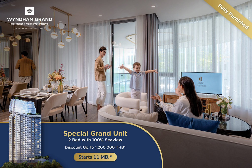 ฮาบิแทท กรุ๊ป ส่งยูนิตไซส์ใหญ่ ดีไซน์หรู โครงการ ‘วินแดม แกรนด์ เรสซิเดนซ์ วงศ์อมาตย์ พัทยา’ (Wyndham Grand Residences Wongamat Pattaya) รับดีมานด์ฮอลิเดย์โฮมบูมต่อเนื่อง เปิดตัวยูนิต 2 ห้องนอน พื้นที่ใช้สอย 72 ตร.ม. – 101 ตร.ม. และ 3 ห้องนอนใหญ่ชั้นสูง 110 ตร.ม. เติมเต็มไลฟ์สไตล์การพักผ่อนของทุกเจเนอเรชั่นชาวไทยและต่างชาติ ทุกยูนิตได้วิวทะเล 100% มาพร้อมโปรแรง Fully Furnished หรือ Fully Decorated แต่งสวยครบ* ในราคาเริ่มต้นเพียง 11 ล้านบาท* พร้อมรับส่วนลดสูงสุดถึง 1.2 ล้านบาท ดีเดย์วันนี้ – 31 ธ.ค. 2566 นี้