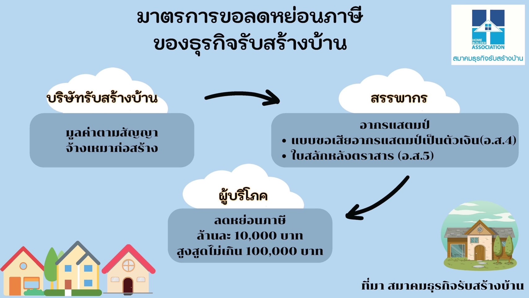 โดยสมาคมฯ ได้นำเสนอให้ #สร้างบ้านลดหย่อนภาษีได้ ด้วยการลดหย่อนภาษีเงินได้บุคคลธรรมดาสำหรับผู้ที่ต้องการปลูกสร้างบ้านบนที่ดินของตนเอง โดยในรายละเอียดจะยึดเอามูลค่าการก่อสร้างบ้านตามสัญญาจ้างเหมาก่อสร้างที่ติดอากรแสตมป์ (อ.ส.5) กับกรมสรรพากร เพื่อนำไปเป็นหลักฐานการลดหย่อนภาษีบุคคลธรรมดาในรอบภาษีปีถัดไป ในอัตราลดหย่อนล้านละ 10,000 บาท และสูงสุดไม่เกิน 100,000 บาท ทั้งนี้หากได้รับการพิจารณาและประกาศใช้อย่างเป็นทางการ นับว่าเป็นครั้งแรกของธุรกิจรับสร้างบ้านที่นำมาตรการด้านลดหย่อนภาษีให้กับคนที่ปลูกสร้างบ้านบนที่ดินตัวเอง