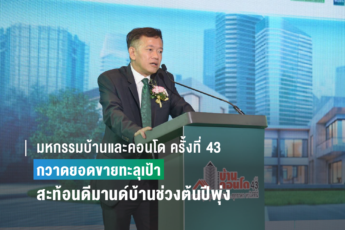 บทพิสูจน์งานมหกรรมบ้านและคอนโด ครั้งที่ 43 ที่จัดขึ้นที่ศูนย์การประชุมแห่งชาติสิริกิติ์ ระหว่าง 23 – 26 มีนาคมที่ผ่านมา ปิดยอดขายภายในวันงานไปมากกว่า 4,000 ล้านบาท และที่คาดว่าจะตามหลังมาถึงกลางปีนี้ ทะลุกว่า 10,000 ล้านบาท เผยดีมานด์ด้านที่อยู่อาศัยในช่วงไตรมาสแรกทะยาน สะท้อนความมั่นใจต่อเศรษฐกิจโดยรวมและการบริโภคภาคเอกชนฟื้นตัวได้ดี ทั้งผู้ประกอบการได้เตรียมสินค้าโครงการต่างๆ มาตอบรับได้ตรงกับความต้องการของผู้บริโภค