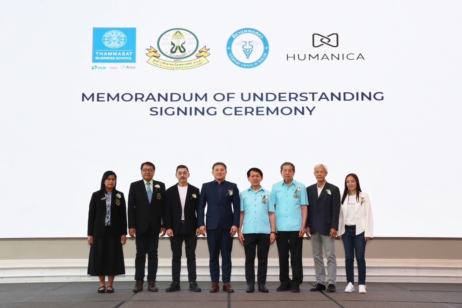 นี่จึงเป็นโอกาสอันดีอีกครั้งหนึ่งที่ทางคณะพาณิชญศาสตร์และการบัญชี โดย ท่านคณบดี รศ.ดร.สมชาย สุภัทรกุล ร่วมกับองค์กรทั้ง 3 แห่งมาเป็นสักขีพยานด้วยการมาร่วมลงนามในสัญญาความร่วมมือ โดยมีผู้บริหารขององค์กรทั้งสามท่านคือ ศ.เกียรติคุณ พญ.สมศรี เผ่าสวัสดิ์ นายกแพทยสภา รศ.นายสัตวแพทย์ ดร.ธีระ รักความสุข นายกสัตวแพทยสภา และคุณสุนทร ดำรงธรรม ประธานกรรมการบริษัท ฮิวแมนิก้า จำกัด (มหาชน) เพื่อร่วมกันเป็นเครือข่ายความร่วมมือในการเชื่อมโยง “องค์ความรู้ – เทคโนโลยี – มาตรฐานวิชาชีพ -การบริหารจัดการ” เข้าด้วยกันอย่างกลมกลืน และนำไปสู่การสร้างระบบเศรษฐกิจและสุขภาวะของประเทศที่ พัฒนา เท่าทัน แข่งขันได้ ยืดหยุ่น มีประสิทธิภาพและยั่งยืน สืบต่อไป