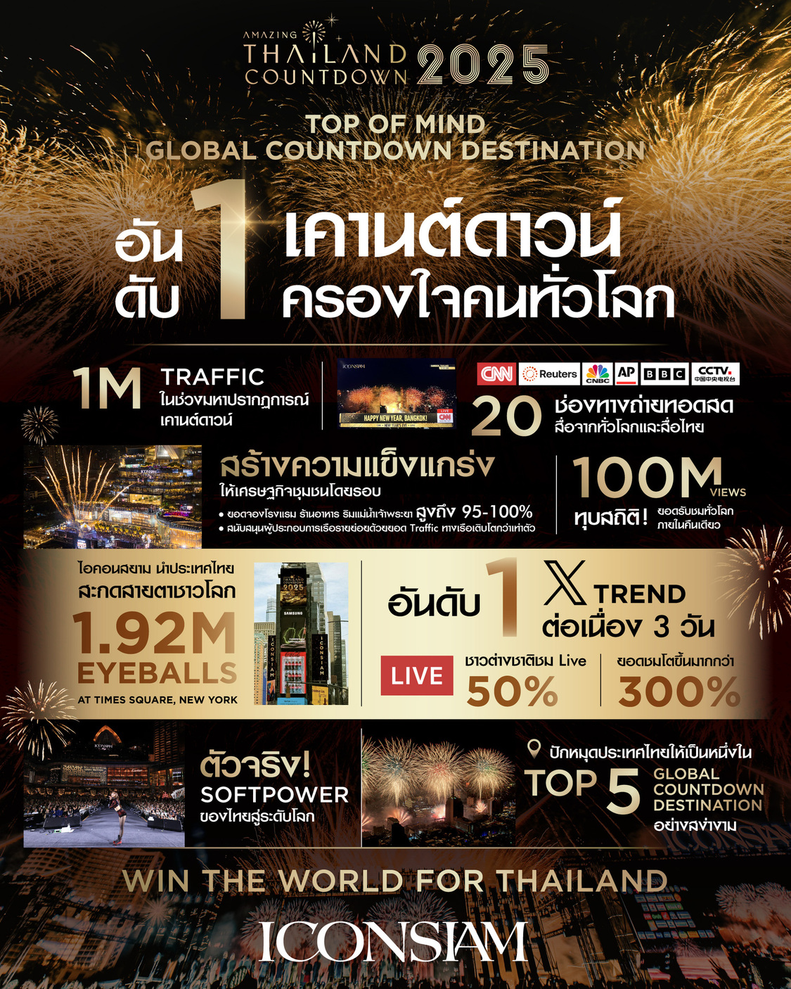 งาน Amazing Thailand Countdown 2025 ณ ไอคอนสยามที่จัดเสร็จสิ้นไปในปีนี้ ไม่เพียงสะท้อนถึงศักยภาพของไอคอนสยามในฐานะแลนด์มาร์กระดับโลก ริมแม่น้ำเจ้าพระยา แต่ยังสะท้อนถึงศักยภาพของประเทศไทยและพลังความร่วมมือของพันธมิตรภาครัฐและเอกชนที่จะช่วยกันขับเคลื่อนเศรษฐกิจ โดยเฉพาะภาคการท่องเที่ยวให้เติบโตอย่างยั่งยืนได้พร้อมสร้างชื่อเสียงภาพลักษณ์ที่ดีให้กับประเทศไปสู่สายตานักท่องเที่ยวทั่วโลก และปักหมุดประเทศไทยให้เป็น Global Destination หนึ่งในประเทศที่ผู้คนทั่วโลกต้องมาเยือนตลอดไป