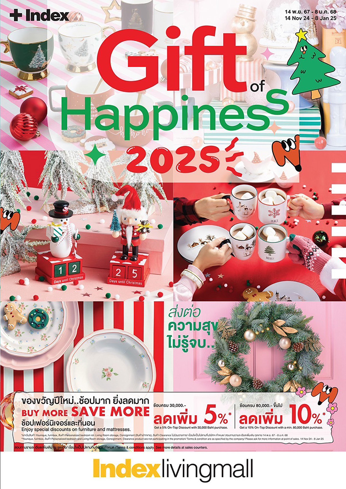 มาร่วมค้นหาของขวัญสุดพิเศษ และเนรมิตบ้านให้ว้าวสุดๆ! พร้อมกับโปรโมชันพิเศษส่งท้ายปีได้กับ เทศกาลของขวัญแห่งปี “Gift of Happiness 2025″ ส่งต่อความสุขไม่รู้จบ… ตั้งแต่วันนี้ – 8 ม.ค.2568 ที่ “อินเด็กซ์ ลิฟวิ่งมอลล์” ทุกสาขาทั่วประเทศ หรือช้อปง่ายๆ ผ่าน www.indexlivingmall.com สอบถามโทร. 1379