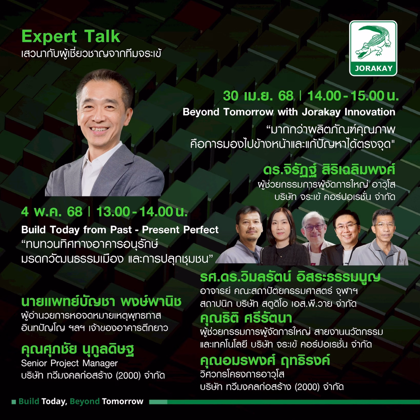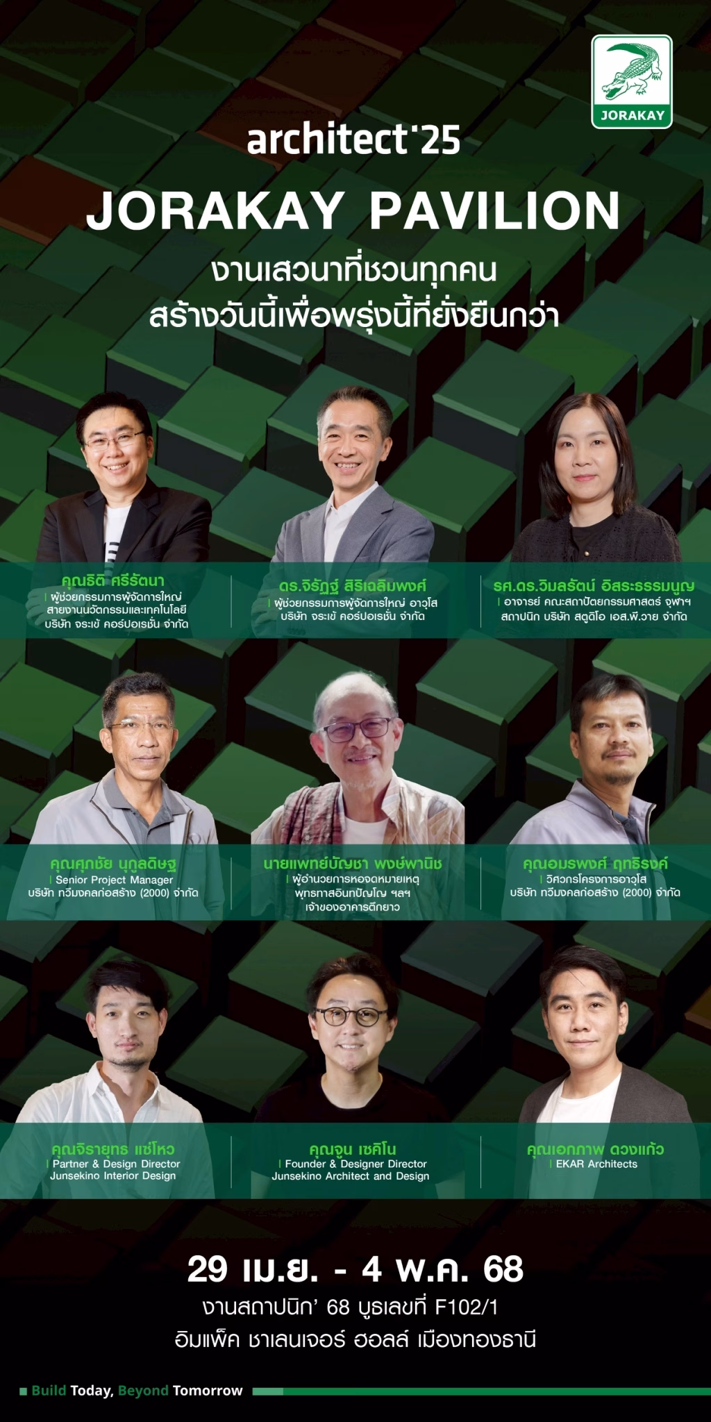 และเตรียมพบกับกิจกรรม EXPERT TALK สุดเอ็กซ์คลูซีฟ ที่ JORAKAY PAVILION กับวิทยากรผู้ทรงคุณวุฒิจากหลากหลายวงการ ผู้เชี่ยวชาญด้านอุตสาหกรรมการก่อสร้าง นักออกแบบ สถาปนิก หรือผู้ใช้งานจริง ที่จะมาแบ่งปันประสบการณ์และความรู้แบบเจาะลึก พร้อมรับฟังหัวข้อเสวนาจากผู้บริหารจระเข้ ที่จะมาถ่ายทอดวิสัยทัศน์ และแนวคิดแบบจัดเต็ม แล้วพบกันวันที่ 29 เม.ย.นี้ ที่บูธหมายเลข F102/1 ในงานสถาปนิก’68 ตั้งแต่วันที่ 29 เมษายน – 4 พฤษภาคม 2568 ณ ชาเลนเจอร์ฮอลล์ อิมแพ็ค เมืองทองธานี บอกเลยว่า ห้ามพลาด!