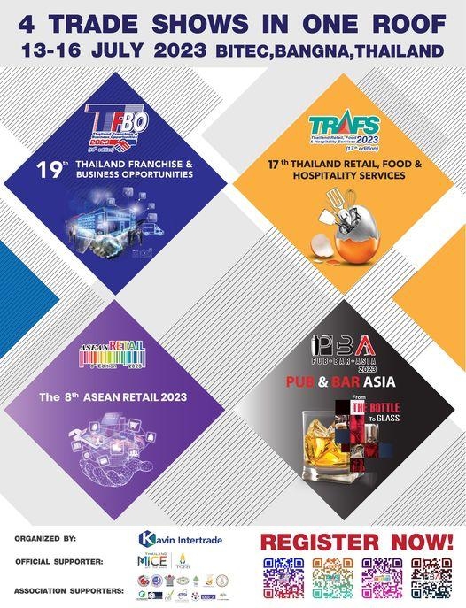 งานทั้ง 4 ประกอบด้วย งานแสดงแฟรนไชส์และโอกาสทางธุรกิจ ปีที่ 19 (TFBO) งานแสดงสินค้าและอุปกรณ์ของใช้วัตถุดิบอาหารและเครื่องดื่ม ปีที่ 17 (TRAFS) งานแสดงเทคโนโลยีและอุปกรณ์ค้าปลีก ปีที่ 8 (ASEAN RETAIL) และงานน้องใหม่ งานแสดงอุปกรณ์ เครื่องดื่ม ชนิดต่างๆ สำหรับ ผับ บาร์ และสถานบันเทิง (PUB & BAR ASIA)