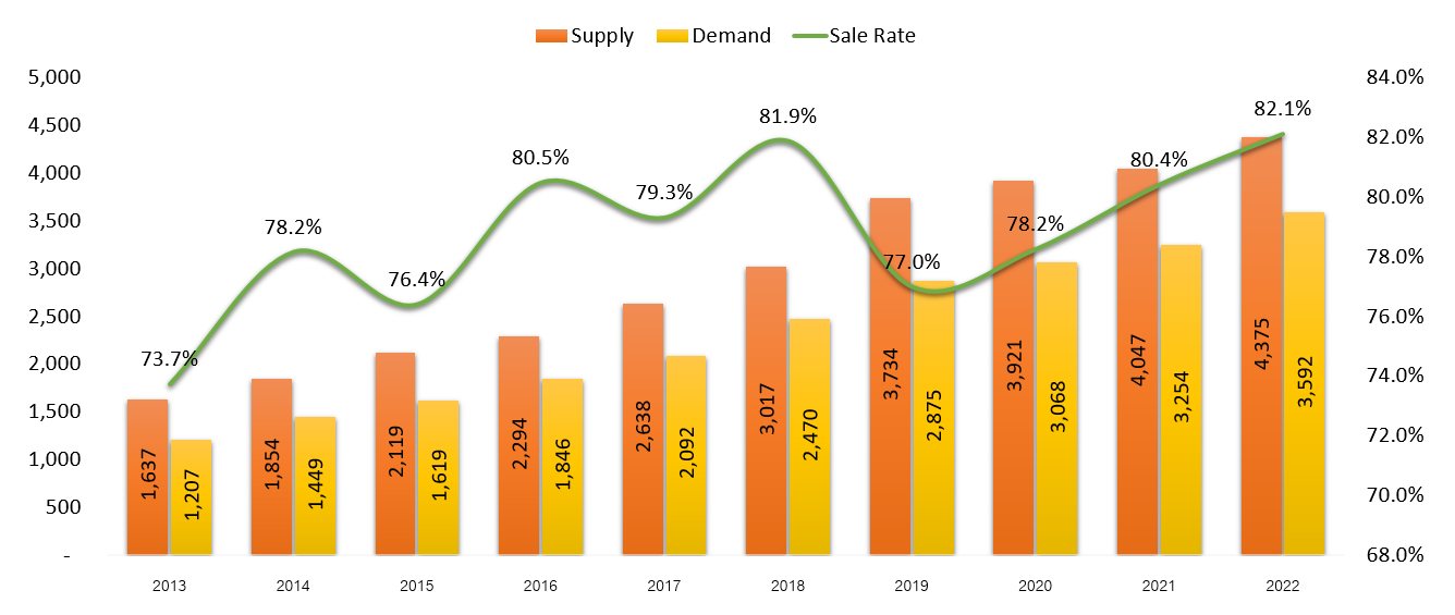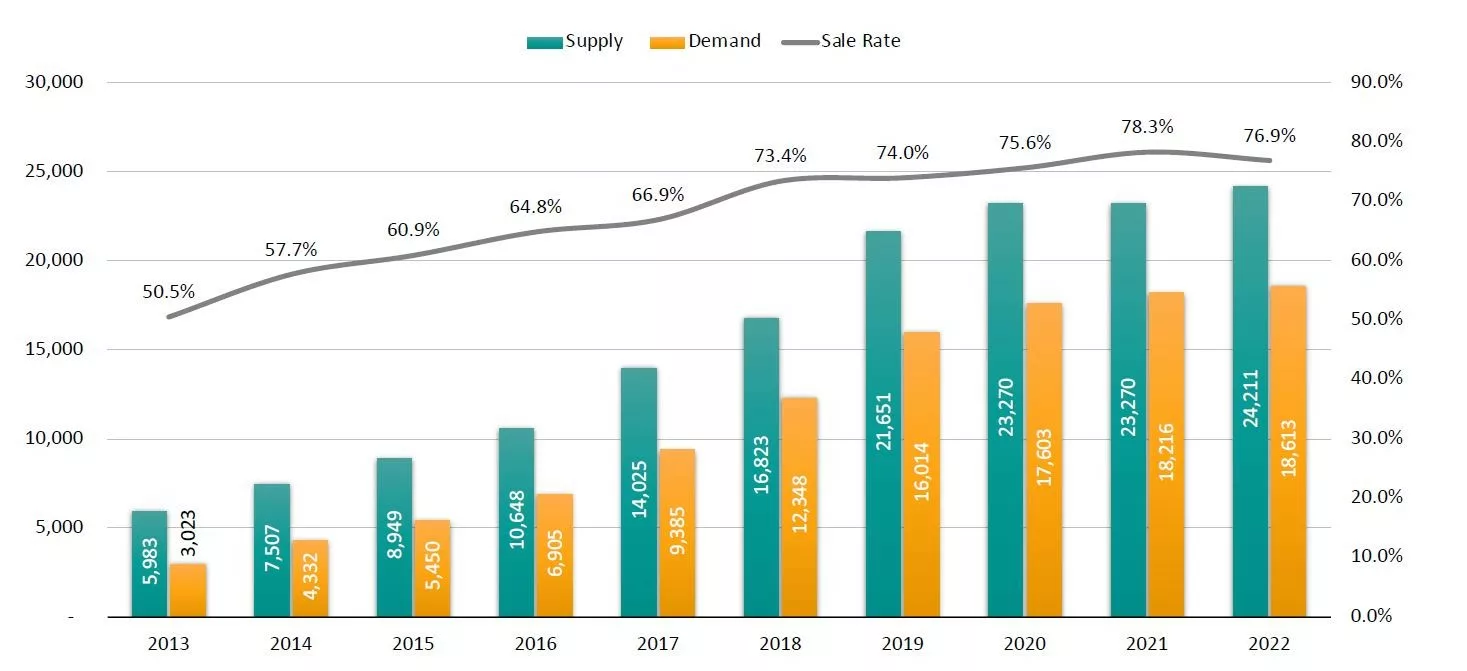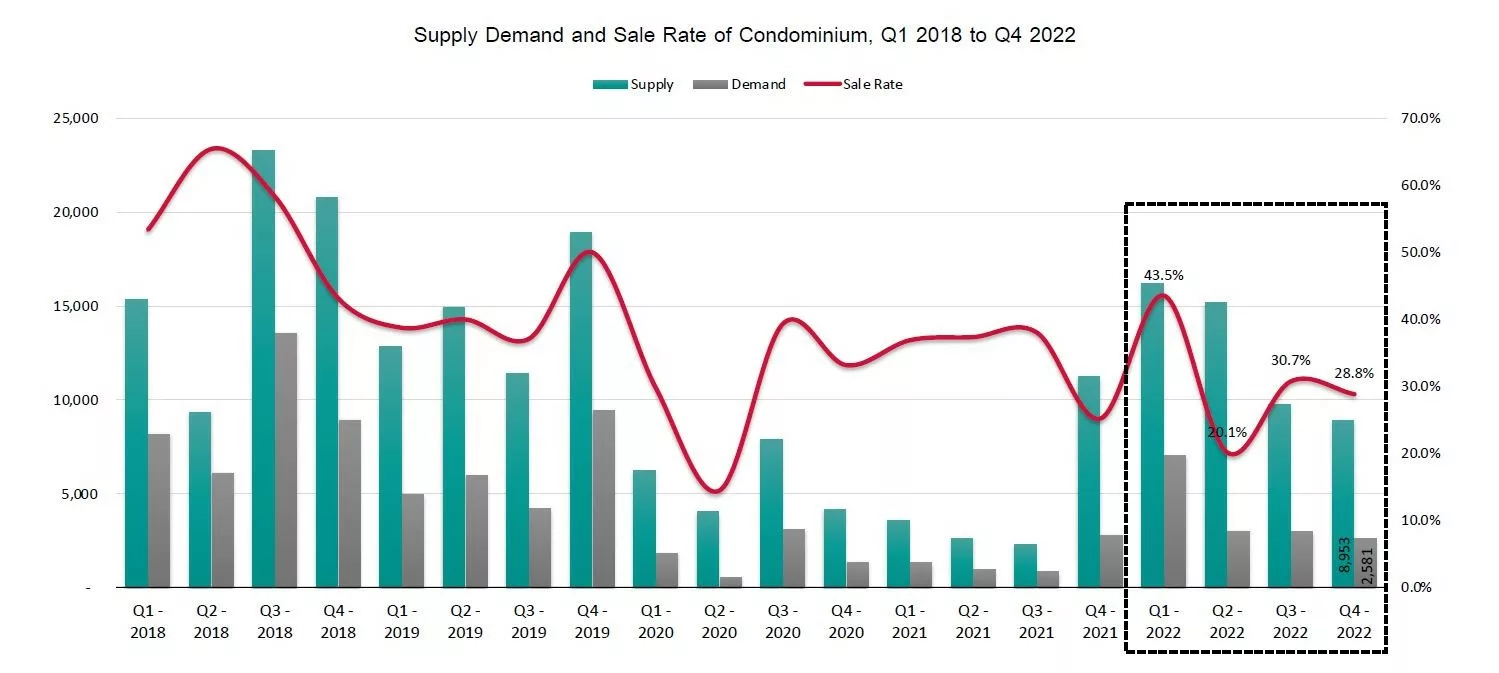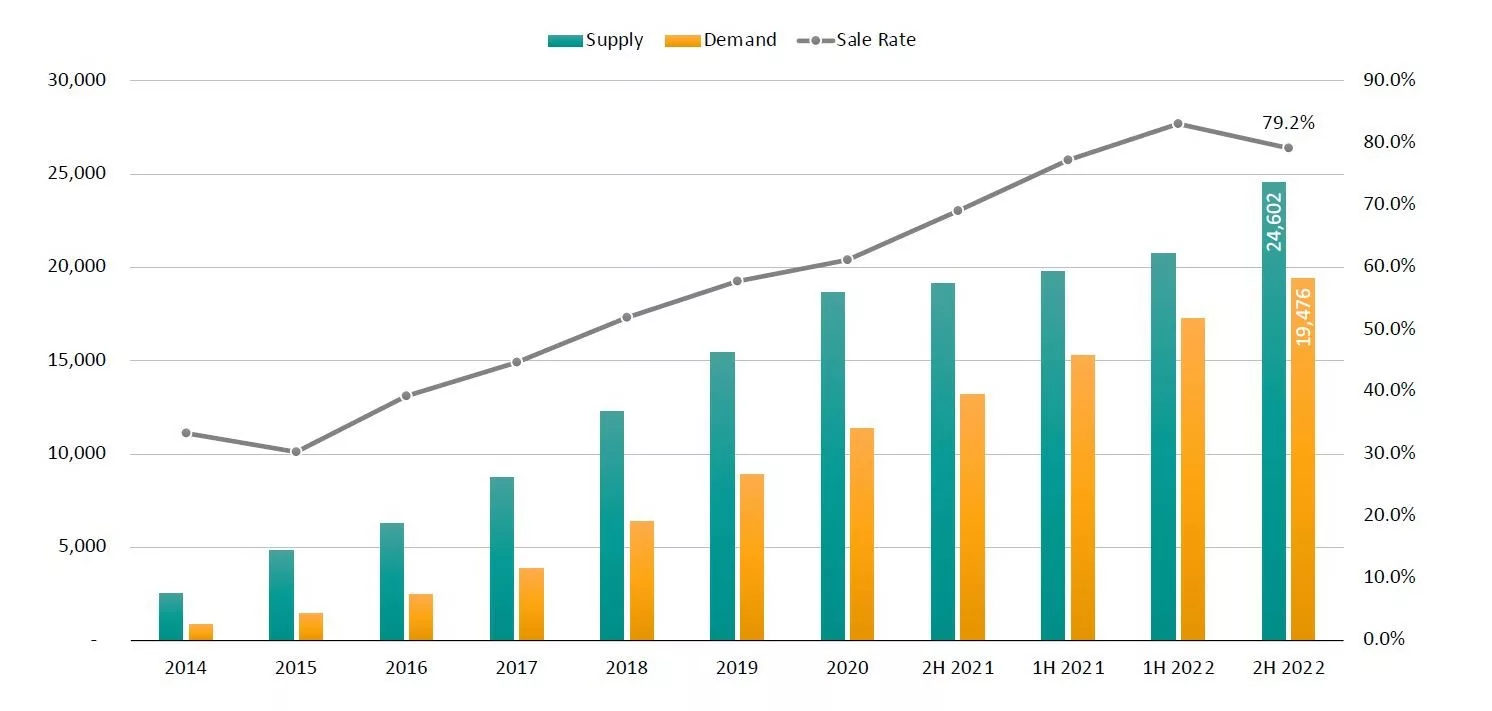 ทั้งนี้ อัตราการขายจะลดลง 3.9 เปอร์เซ็นต์จากครึ่งแรกของปี 2565 แต่ก็เพิ่มขึ้น 1.9 เปอร์เซ็นต์เทียบกับช่วงเดียวกันของปี 2564 ซึ่งเป็นผลจากอุปทานที่เพิ่มขึ้นสองเท่าของอุปทานที่มีเหลืออยู่