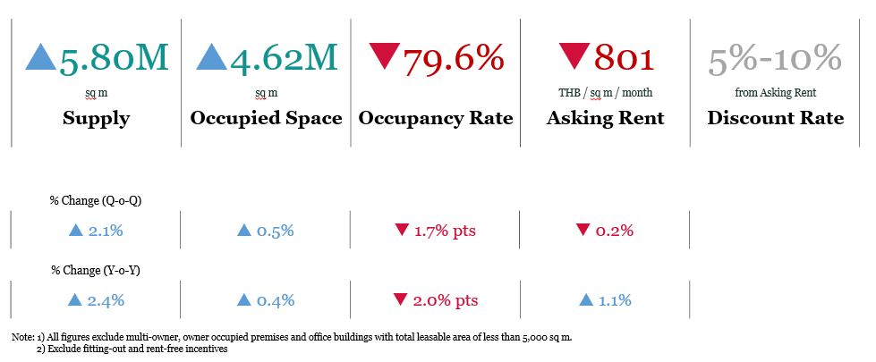 ในช่วงปลายปี 2565 มีพื้นที่อาคารสำนักงานขยายตัว 117,000 ตร.ม.หรือ 2.1 เปอร์เซ็นต์เมื่อเทียบไตรมาสต่อไตรมาส ส่งผลให้ภาพรวมตลาดอาคารสำนักงานมีพื้นที่ 5.79 ล้าน ตร.ม. และในจำนวนเป็นพื้นที่อาคารสำนักงานสร้างใหม่ที่ผ่านการรับรองอาคารสีเขียว 1,180,000 ตร.ม. คิดเป็น 20 เปอร์เซ็นต์ของพื้นที่สำนักงานให้เช่าทั้งหมด