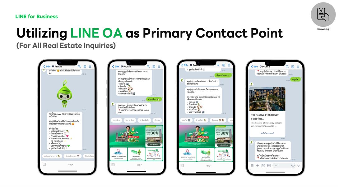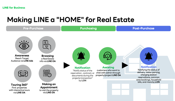 ธุรกิจควรเริ่มจากการสร้าง LINE Official Account หรือ LINE OA ให้เป็นเสมือนบ้านของแบรนด์บนโลกออนไลน์ เป็นแหล่งข้อมูล ศูนย์กลางการติดต่อสื่อสารกับลูกค้า โดยเฉพาะอย่างยิ่งในช่วงของ Pre-Purchase หรือช่วงการเลือกหา บ้านที่ถูกใจ LINE OA สามารถทำหน้าเป็นแหล่งข้อมูล ตอบคำถามลูกค้าผ่านแชตได้ นำเสนอ/อัปเดตข้อมูลน่าสนใจผ่านฟีเจอร์ริชเมนูและการบรอดแคสต์ข้อความ เปิดให้ชมบ้านแบบออนไลน์ ตลอดจนการนัดหมายเพื่อเข้าชมบ้านจริง ซึ่งนอกจากช่วยให้ลูกค้าสะดวกสบาย ยังช่วยให้แบรนด์สามารถเก็บรวบรวมข้อมูลความสนใจ พฤติกรรมของลูกค้า เพื่อนำเสนอเนื้อหา โปรโมชั่นที่ตรงความต้องการ ตรงใจของลูกค้าแต่ละคน แต่ละกลุ่มได้ในอนาคต ทำให้ที่ผ่านมา มีการเปิดใช้งาน LINE OA ของผู้ประกอบการอสังหาฯ ตามโครงการต่างๆ เพิ่มมากขึ้นอย่างต่อเนื่อง โดยในปีล่าสุด มีการเติบโตถึง 20% และมีการเติบโตของการส่งข้อความแชตบน LINE OA ของธุรกิจอสังหาฯ เพิ่มขึ้นมากถึง 34%