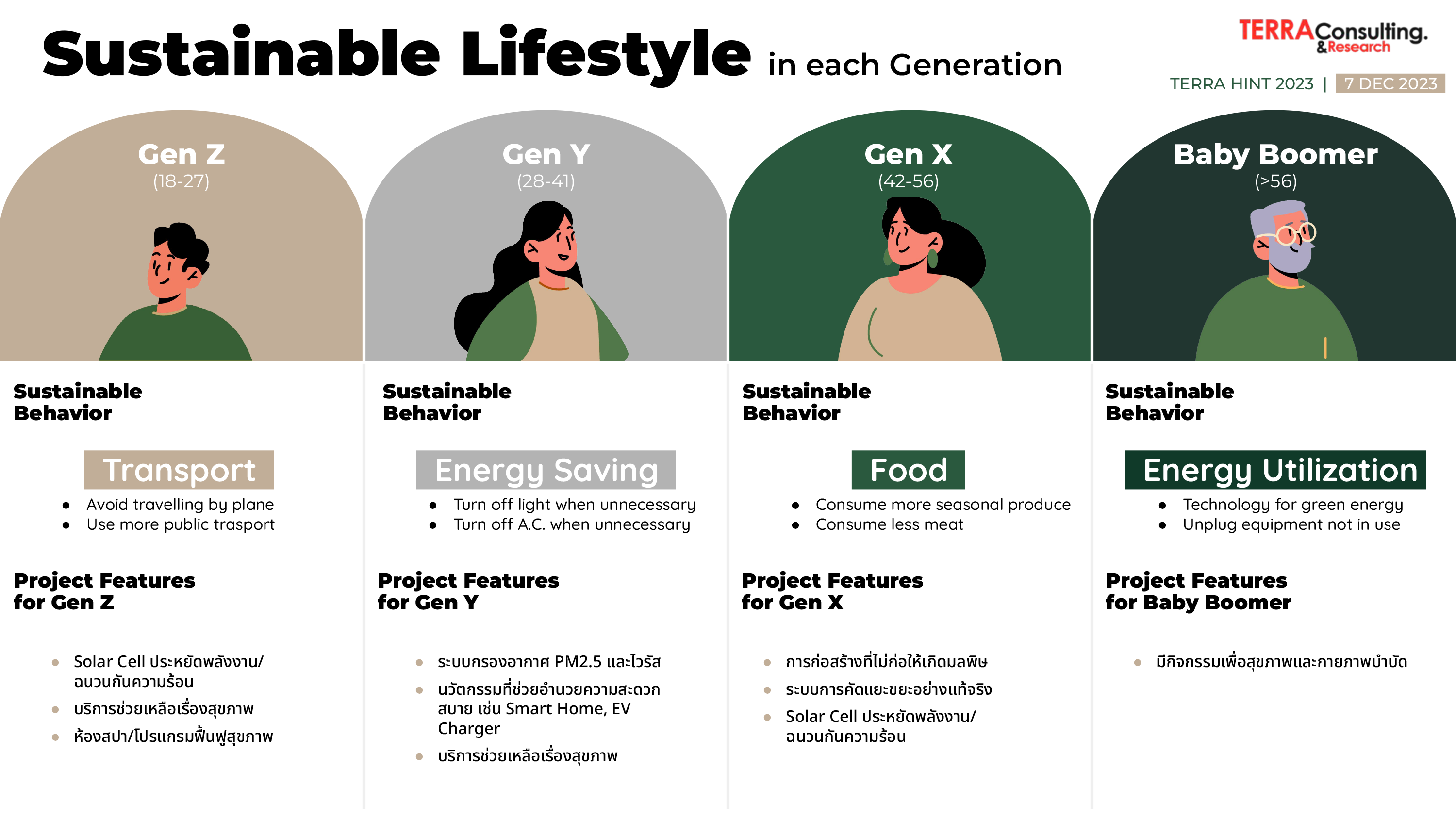 ทั้งนี้จากผลวิจัยจะเห็นว่า sustainable lifestyles ของคนแต่ละกลุ่มมีพฤติกรรมที่แตกต่างกัน โดยกลุ่ม Gen Z (อายุ 18-27 ปี) จะเป็นกลุ่มที่ใส่ใจเรื่องการเดินทาง โดยส่วนใหญ่จะเน้นการใช้ระบบขนส่งสาธารณะกันมาก ส่วนกลุ่ม Gen Y (อายุ 28-41 ปี) ให้ความใส่ใจด้านพลังงานเช่นการเปิด-ปิดไฟเมื่อไม่จำเป็น, กลุ่ม Gen X (อายุ 46-56 ปี) จะเป็นคนที่สนใจเรื่องอาหาร และสุขภาพ เช่น ลดการกินเนื้อสัตว์ หรือกินพืชผักตามฤดูกาล และกลุ่ม Baby boomer (อายุมากกว่า 56 ปีขึ้นไป)เป็นกลุ่มที่มีความน่าสนใจมาก เพราะคนกลุ่มนี้หันมาให้ความสำคัญกับเรื่องเทคโนโลยีสีเขียวเช่น โซล่าร์เซลล์ มากขึ้น