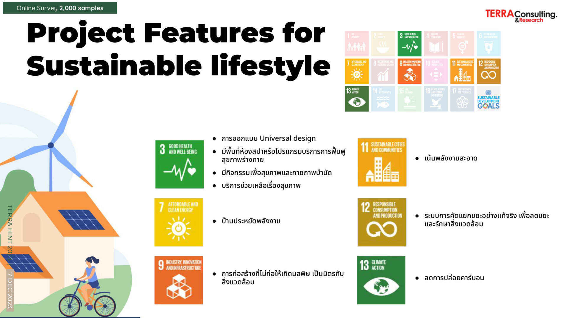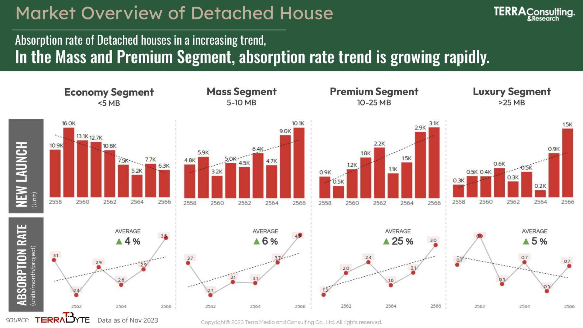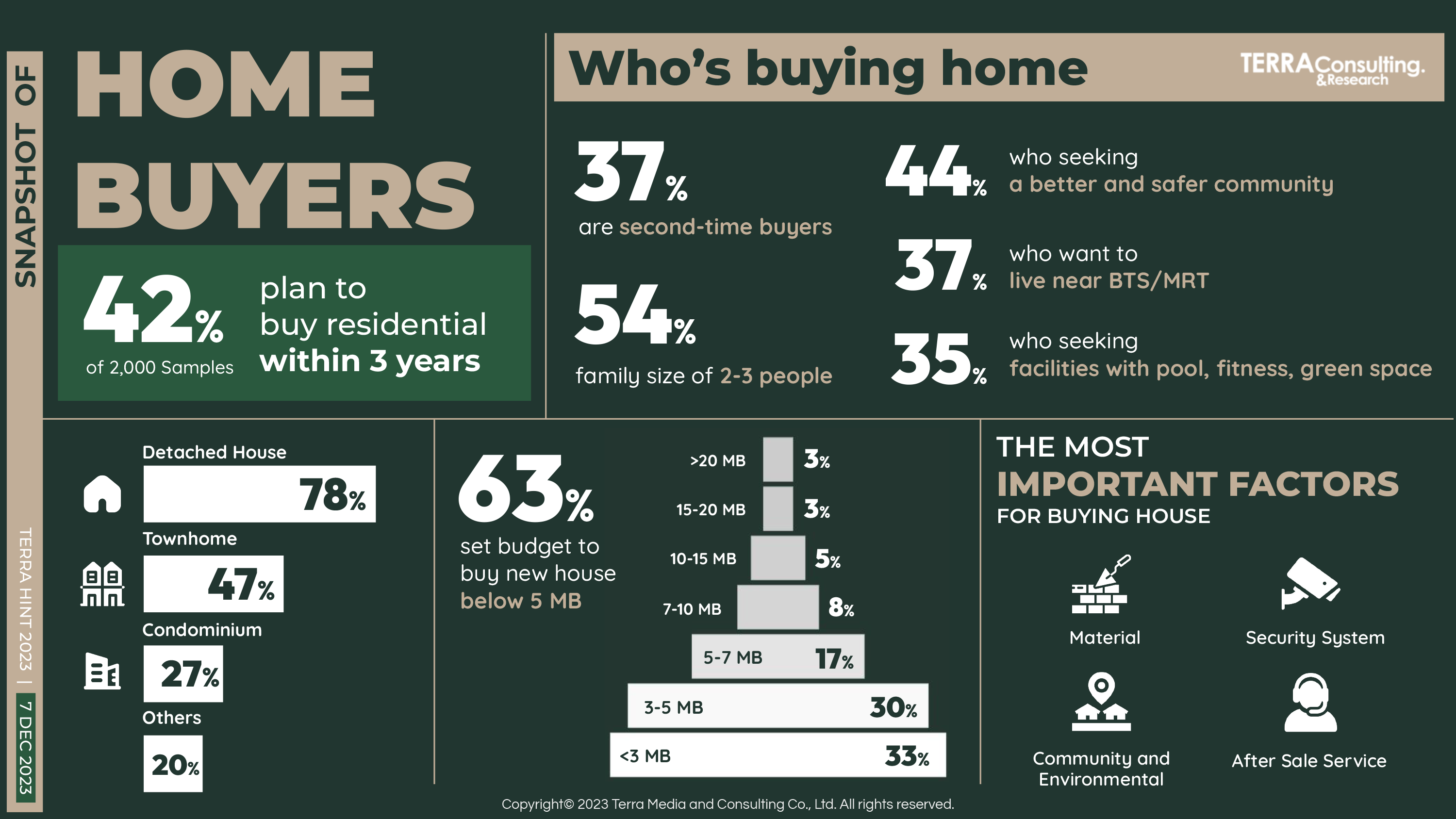 นางสาว สุมิตรา วงภักดี กรรมการผู้จัดการ บริษัท เทอร์ร่า มีเดีย แอนด์ คอนซัลติ้ง จำกัด หรือ TERRA BKK กล่าวว่า จากผลวิจัย The most powerful of real estate brand 2023 และเจาะลึกพฤติกรรมผู้บริโภคตามแนวคิด Well-Being and Sustainable Lifestyle จากแบบสอบถามกับกลุ่มตัวอย่าง 2,000 คน พบว่า ผู้ตอบกว่า 42% มีแผนจะซื้อบ้านในช่วง 3 ปี โดยส่วนใหญ่มีความต้องการซื้อบ้านเดี่ยวและทาวน์โฮม ในระดับราคาตั้งแต่ 3 – 7 ล้านบาท โดยปัจจัยสำคัญที่ทำให้ตัดสินใจซื้อบ้านปีนี้คนส่วนใหญ่ให้ความใส่ใจเรื่องวัสดุก่อสร้างกันมากขึ้น รองลงมาคือ ระบบรักษาความปลอดภัย, สังคมและสิ่งแวดล้อมและบริการหลังการขาย