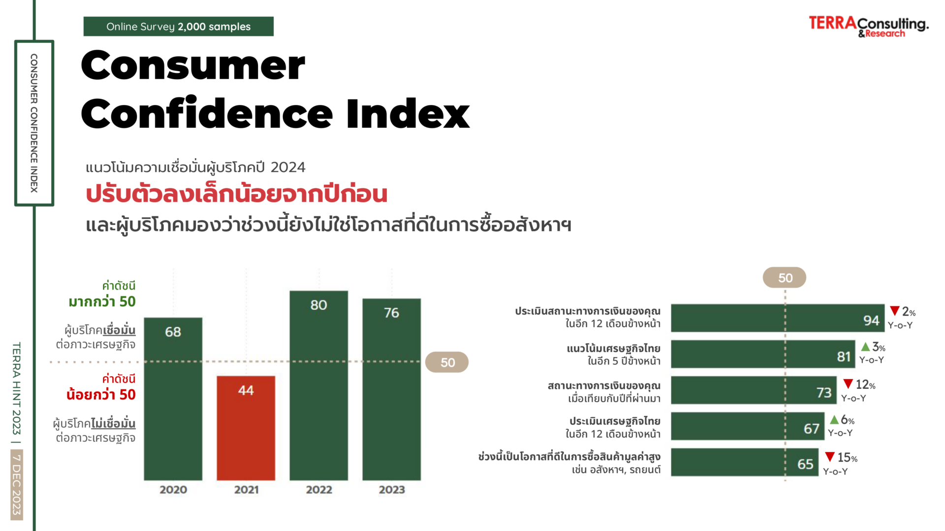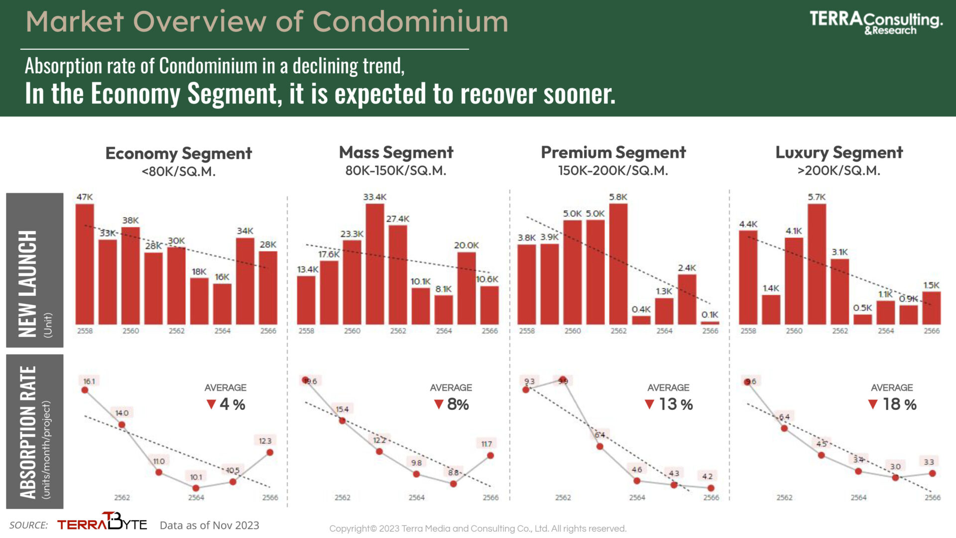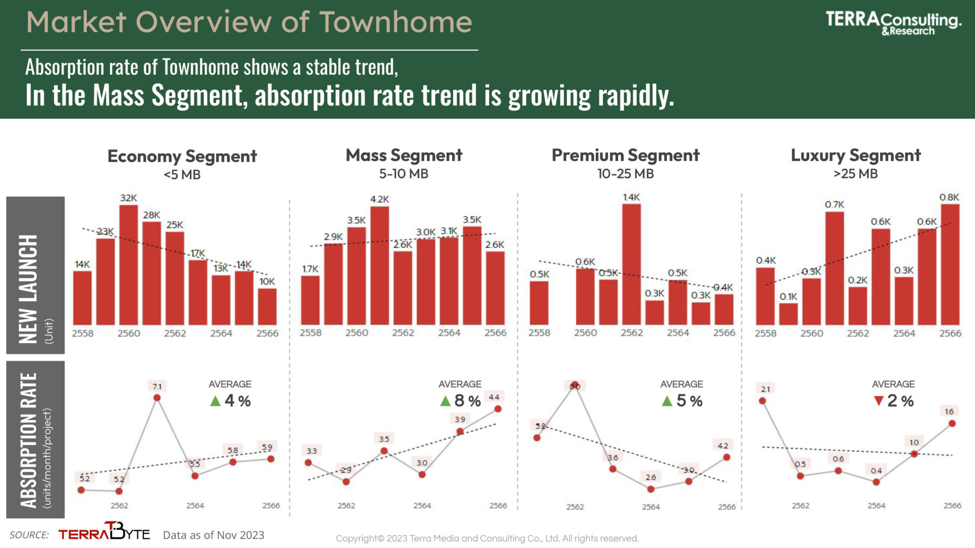 นางสาว สุมิตรา วงภักดี กรรมการผู้จัดการ บริษัท เทอร์ร่า มีเดีย แอนด์ คอนซัลติ้ง จำกัด หรือ TERRA BKK กล่าวว่า จากผลวิจัย The most powerful of real estate brand 2023 และเจาะลึกพฤติกรรมผู้บริโภคตามแนวคิด Well-Being and Sustainable Lifestyle จากแบบสอบถามกับกลุ่มตัวอย่าง 2,000 คน พบว่า ผู้ตอบกว่า 42% มีแผนจะซื้อบ้านในช่วง 3 ปี โดยส่วนใหญ่มีความต้องการซื้อบ้านเดี่ยวและทาวน์โฮม ในระดับราคาตั้งแต่ 3 – 7 ล้านบาท โดยปัจจัยสำคัญที่ทำให้ตัดสินใจซื้อบ้านปีนี้คนส่วนใหญ่ให้ความใส่ใจเรื่องวัสดุก่อสร้างกันมากขึ้น รองลงมาคือ ระบบรักษาความปลอดภัย, สังคมและสิ่งแวดล้อมและบริการหลังการขาย
