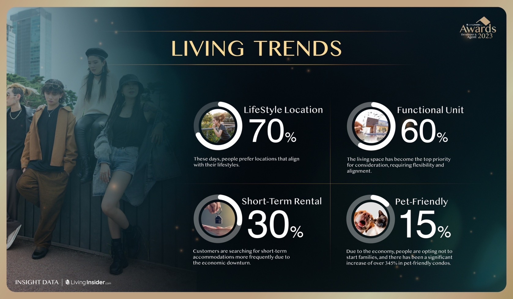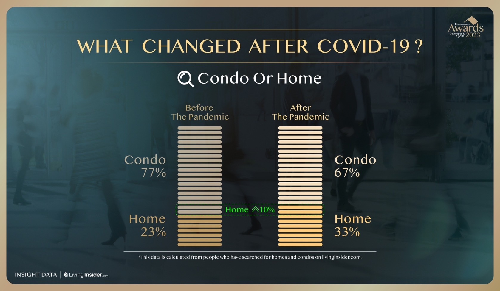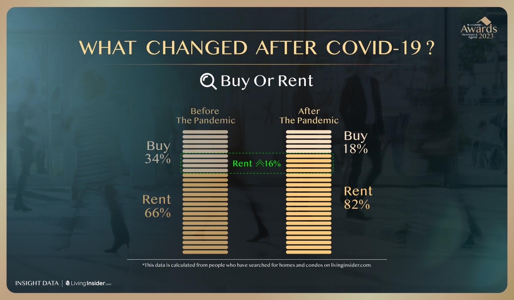 นายภูวนัย ภัทรโภคิณ ประธานกรรมการเจ้าหน้าที่บริหาร บริษัท ลิฟวิ่ง อินไซเดอร์ จำกัด กล่าวถึง Livinginsider Data Insight 2023 ตลาดอสังหาริมทรัพย์ไทย โดยให้ข้อมูลเชิงเปรียบเทียบ อ้างอิงจากข้อมูล ผู้ใช้งาน บนแพลตฟอร์ม Livinginsider.com ว่า พฤติกรรมของผู้บริโภคที่เปลี่ยนแปลงไป หลังเกิดวิกฤตการโควิด 19 ซึ่งจากข้อมูลในปี 2018-2019 มีการค้นหา บ้าน อัตราร้อยละ 23 คอนโด ร้อยละ 77 ในส่วนของการค้นหาเช่า-ซื้อนั้น มีค้นหาการเช่าอยู่ที่อัตราร้อยละ 66 และค้นหาการซื้อ ร้อยละ 34 ขณะที่หลังวิกฤติการแพร่ระบาดของเชื้อไวรัสโควิด 19 พบว่าการค้นหา บ้าน อัตราร้อยละ 67 คอนโด ร้อยละ 33 ด้านการค้นหาเช่า-ซื้อ มีค้นหาการเช่าอยู่ที่อัตราร้อยละ 82 และค้นหาการซื้อ ร้อยละ 18