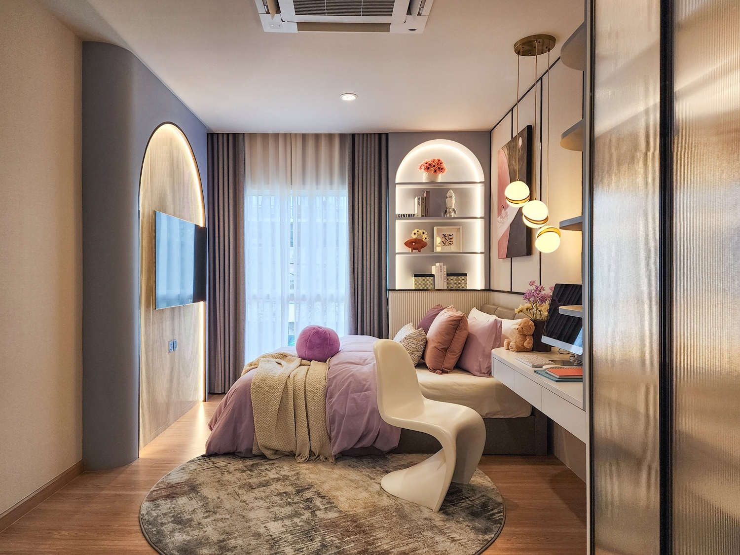 ในส่วนของชั้น 2 จะเป็นส่วนของห้องนอน ทุกห้องถูกออกแบบให้มีความเป็นส่วนตัว กำหนดทิศทางของแสงที่ตกกระทบ โดยเฉพาะห้อง Master Bedroom มีการออกแบบตกแต่งให้ดูโปร่งสบายและเปิดมุมมองสู่สวนด้านนอก เพื่อชมความเขียวขจีจากธรรมชาติที่อยู่รอบห้อง พื้นที่ถูกจัดให้ครบตั้งแต่ ”Walk in Closet โซนพักผ่อน ไปจนถึงห้องน้ำที่รับแสงธรรมชาติพอดี ๆ นอกจากนี้ ยังมีออกแบบทางระเบียงเชื่อมห้อง ซึ่งนับว่าเป็นฟังก์ชันที่ทำให้บ้าน “น่าอยู่ขึ้นจริง” ในส่วนของห้องนอนลูก ยังให้ความสำคัญกับแสงที่ดี มีความเป็นส่วนตัว และจัดฟังก์ชันครบ ดีไซน์ต่างๆ สามารถใช้งานได้เต็มพื้นที่ วางมุมหน้าต่างในทิศทางที่ได้รับแสงธรรมชาติ แต่ยังเป็นส่วนตัวด้วยการปิดกั้นการมองเห็นระหว่างบ้านตรงข้ามด้วย