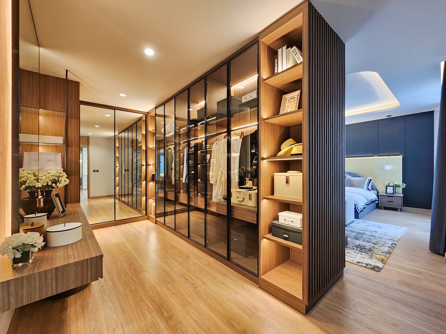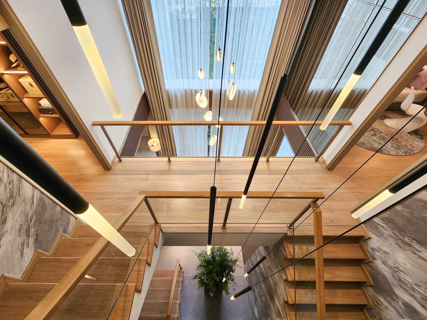 ทำหน้าที่เป็น Buffer Zone ที่จัดจังหวะชีวิตให้เป็นระเบียบก่อนก้าวสู่พื้นที่หลักของบ้าน มีตู้เก็บรองเท้าขนาดใหญ่ซ่อนตัวอยู่ เดินเข้ามาด้านในจะสัมผัสถึง Double Space ซึ่งเป็นเสมือนลมหายใจที่ปล่อยให้ความโปร่งโล่งได้ทำงาน และพื้นที่เพดานแนวตั้งยังช่วยสร้างมิติที่ทำให้บ้านดูใหญ่ขึ้น มีการเลือกใช้เฟอร์นิเจอร์แบบ Built-in ที่ถูกฝังแนบไปกับผนังอย่างเนี๊ยบเพื่อเป็นการลดรอยต่อของสายตา เพื่อเปิดพื้นที่ให้กว้างอย่างไร้ความวุ่นวาย มีการเลือกเฉดสีของเฟอร์นิเจอร์เทาเข้ม ดำ เพื่อสื่อให้สัมผัสถึงความรู้สึกนิ่ง สงบ และมีระดับ เพราะความหรูหราในแบบ LPN ไม่ใช่ความฟู่ฟ่า แต่คือความเท่ที่นิ่ง ลุ่มลึก หนักแน่นและทรงพลัง ภายในบ้านยังมีการดีไซน์มุมพักผ่อนเพื่อให้ทุกคนในครอบครัวได้ใกล้ชิดธรรมชาติ หรือจะปรับให้เป็นมุมสังสรรค์กับครอบครัว เพื่อนสนิทที่แวะเวียนมา สามารถเดินเชื่อมต่อมายังห้องรับแขก และห้องครัว ที่มีการวางแปลนให้สามารถเชื่อมต่อไปยังส่วน Dining และ Living โดยมีการกันกระจกเพื่อปิดกั้นเสียงรบกวนจากการทำอาหาร รวมถึงกลิ่นที่อาจจะเข้ามารบกวนสมาชิกที่อยู่ในโซนอื่นๆ ด้วย