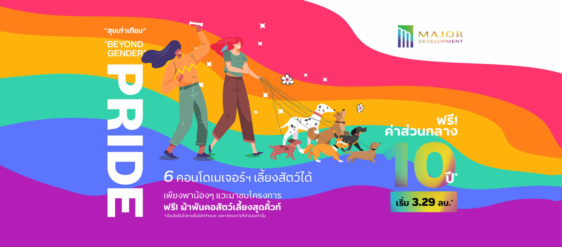 บริษัท เมเจอร์ ดีเวลลอปเม้นท์ จำกัด (มหาชน) ผู้นำด้านการพัฒนาธุรกิจอสังหาริมทรัพย์ระดับลักชัวรี่และคอนโดมิเนียมเลี้ยงสัตว์ได้ (Pet-Friendly Residences) ตอกย้ำการเป็นแบรนด์ที่ให้ความสำคัญกับแนวคิด #สุขเท่าเทียม เดินหน้าสนับสนุน “ความเท่าเทียม” ให้ความสำคัญกับ “ความหลากหลาย” และส่งเสริม “ความเสมอภาค” ให้เกิดขึ้นในสังคมไทย สะท้อนความมุ่งมั่นและความเอาจริงเอาจังในการผลักดันประเด็นดังกล่าวอย่างยั่งยืน พร้อมต้อนรับ Pride Month ด้วยการรังสรรค์หลากความพิเศษสำหรับทั้งพนักงานในองค์กรด้วยนโยบายที่เล็งเห็นคุณค่าและความสำคัญ การสร้างสีสันเพื่อแสดงออกถึงการร่วมสนับสนุนเดือนแห่งความภาคภูมิใจของกลุ่ม LGBTQ+ ด้วยการตกแต่งสถานที่ทั้งในสำนักงานและโครงการต่างๆ พร้อมเปิดดีลเด็ด “ฟรีค่าส่วนกลางสูงสุด 10 ปี* สำหรับคอนโดมิเนียมพร้อมอยู่ ออนท็อปด้วยโปรพิเศษ และผนึกธนาคารต่างๆ เพื่อมอบ สินเชื่อเพื่อคู่รักเพศเดียวกัน” ใน 6 โครงการคอนโดมิเนียมของเมเจอร์ฯ ที่เลี้ยงสัตว์ได้ เอาใจคนทุกเพศ ตลอดเดือนมิถุนายนนี้