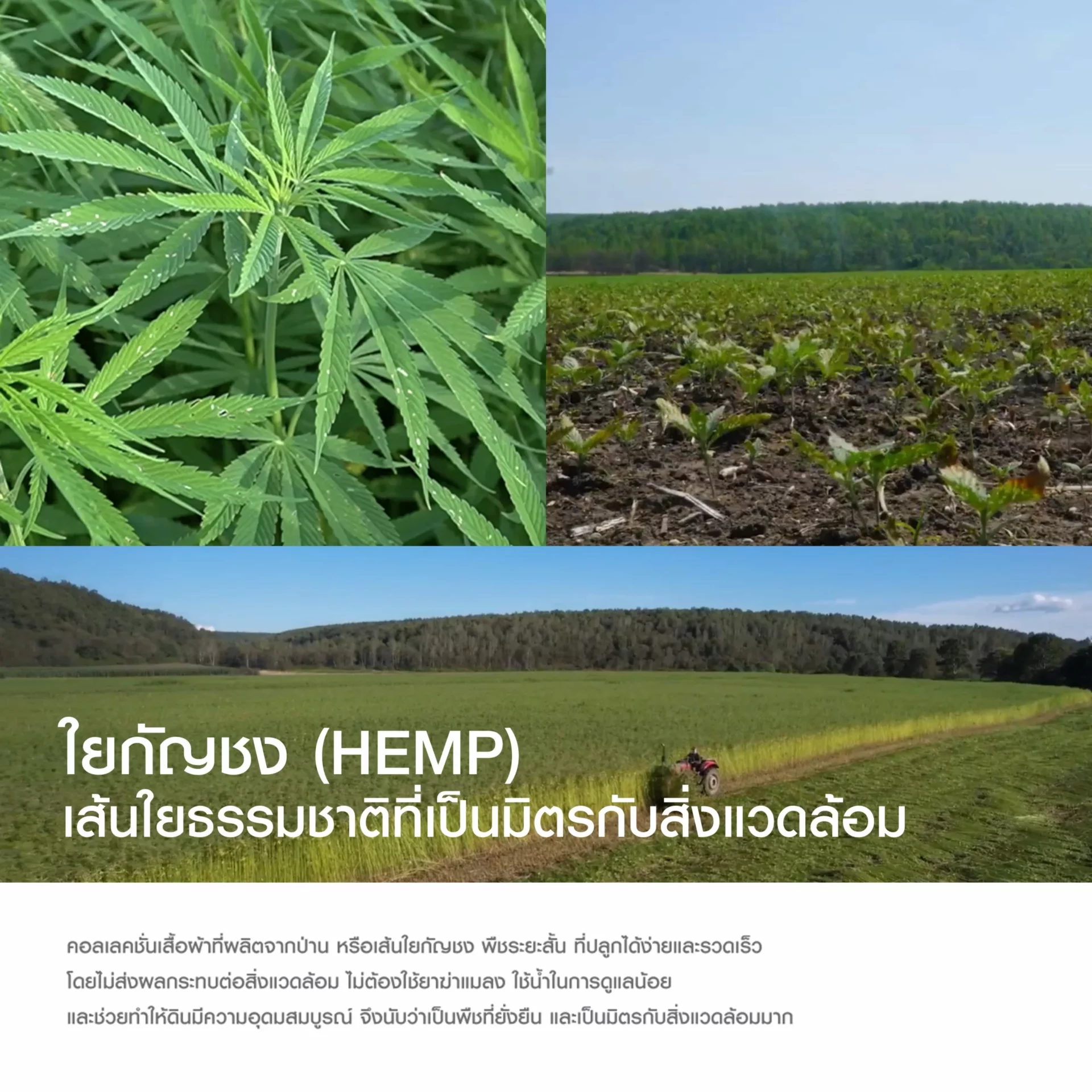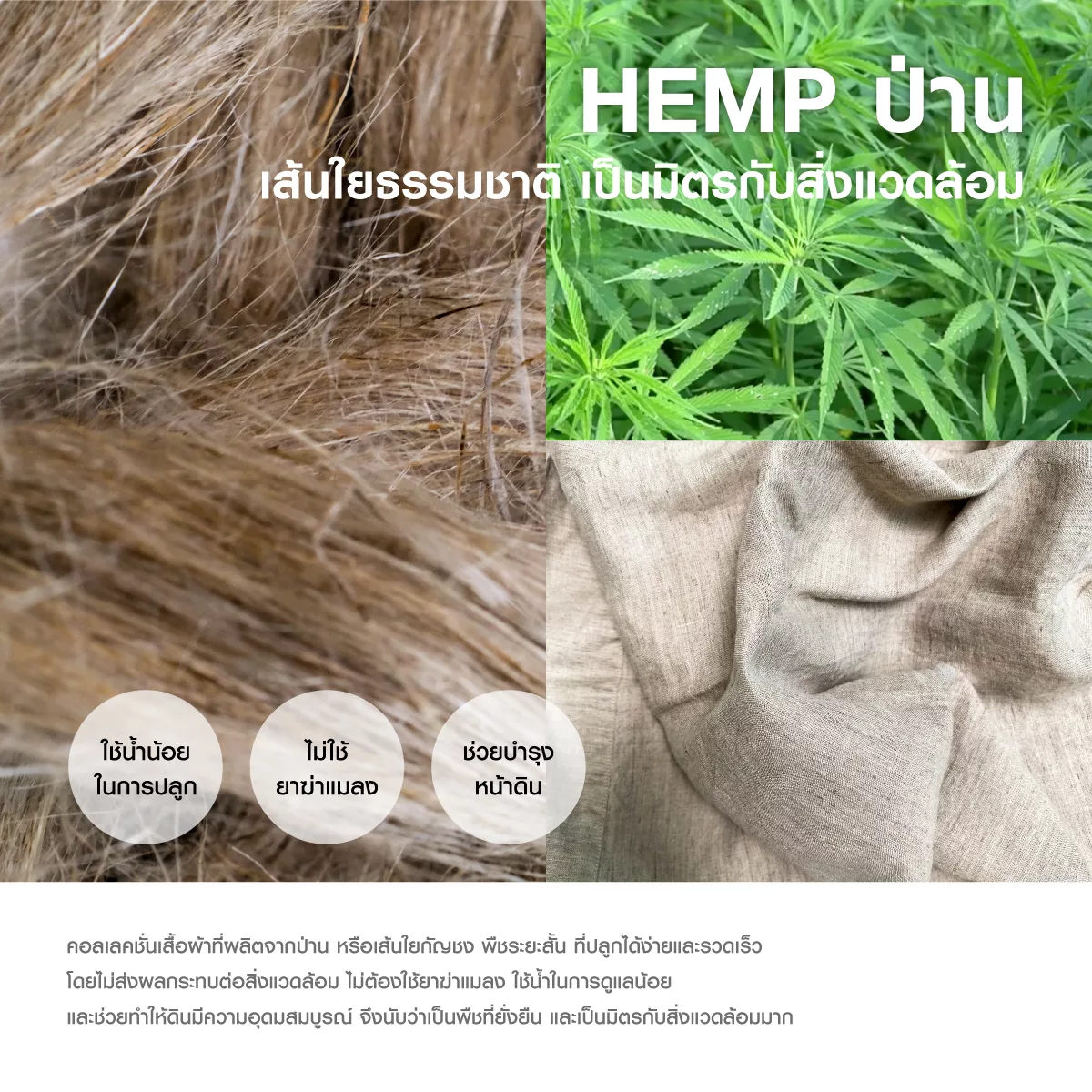 “จากเทรนด์ดังกล่าว รวมกับพันธกิจหลักของ MUJI ในการดำเนินธุรกิจแบบยั่งยืนที่ยึดถือ และพิสูจน์มาอย่างต่อเนื่อง ล่าสุด MUJI ได้นำ “เส้นใยกัญชง” (Hemp) มาใช้เป็นวัสดุหลักในคอลเลคชันนี้ และจะเป็นอีกหนึ่งวัสดุหลักในการผลิตสินค้าเครื่องกาย MUJI โดยถือเป็นวัสดุทางเลือกเพื่อความยั่งยืน เพราะกระบวนการผลิตตั้งแต่ต้นน้ำไปจนถึงปลายน้ำสะท้อนคุณค่าการผลิตอย่างยั่งยืน เนื่องจากเส้นใยป่านเป็นผลผลิตจากพืชกัญชงที่มีวงจรการเพาะปลูกสั้น และเจริญเติบโตได้ดีโดยไม่ต้องใช้การดูแลมากเมื่อเทียบกับพืชชนิดอื่น ๆ เมื่อเริ่มเพาะปลูกจะใช้เวลาเพียงประมาณ 100 วันหรือประมาณ 3 เดือน ให้เจริญเติบโตเต็มวัย มีขนาดของลำต้นสูงได้มากสุดถึง 3 เมตร ก็เริ่มเก็บเกี่ยวผลผลิตได้เลย นอกจากนี้ ในการดูแลถือว่าใช้ทรัพยากรน้อยกว่า เมื่อเทียบกับเส้นใยวัสดุที่ทำจากผลผลิตของพืชชนิดอื่น ๆ และใช้น้ำในการเพาะปลูกน้อยกว่า รวมถึงไม่จำเป็นต้องใช้ปุ๋ยหรือสารเคมีเร่งก็สามารถเจริญเติบโตได้ดี อีกทั้งมีความคงทนต่อสภาพอากาศและโรคทางการเกษตร และอายุวงจรของพืชมีระยะสั้นเพียง 1 ปี จึงทำให้สามารถเพาะปลูกใหม่ในพื้นที่เดิมได้ โดยไม่ทำลายพื้นที่ป่าหรือสิ่งแวดล้อมโดยรวม และยังเป็นพืชที่ช่วยบำรุงหน้าดิน สร้างความอุดมสมบูรณ์ให้กับพื้นดินอีกด้วย” นายคาโมการิ กล่าว