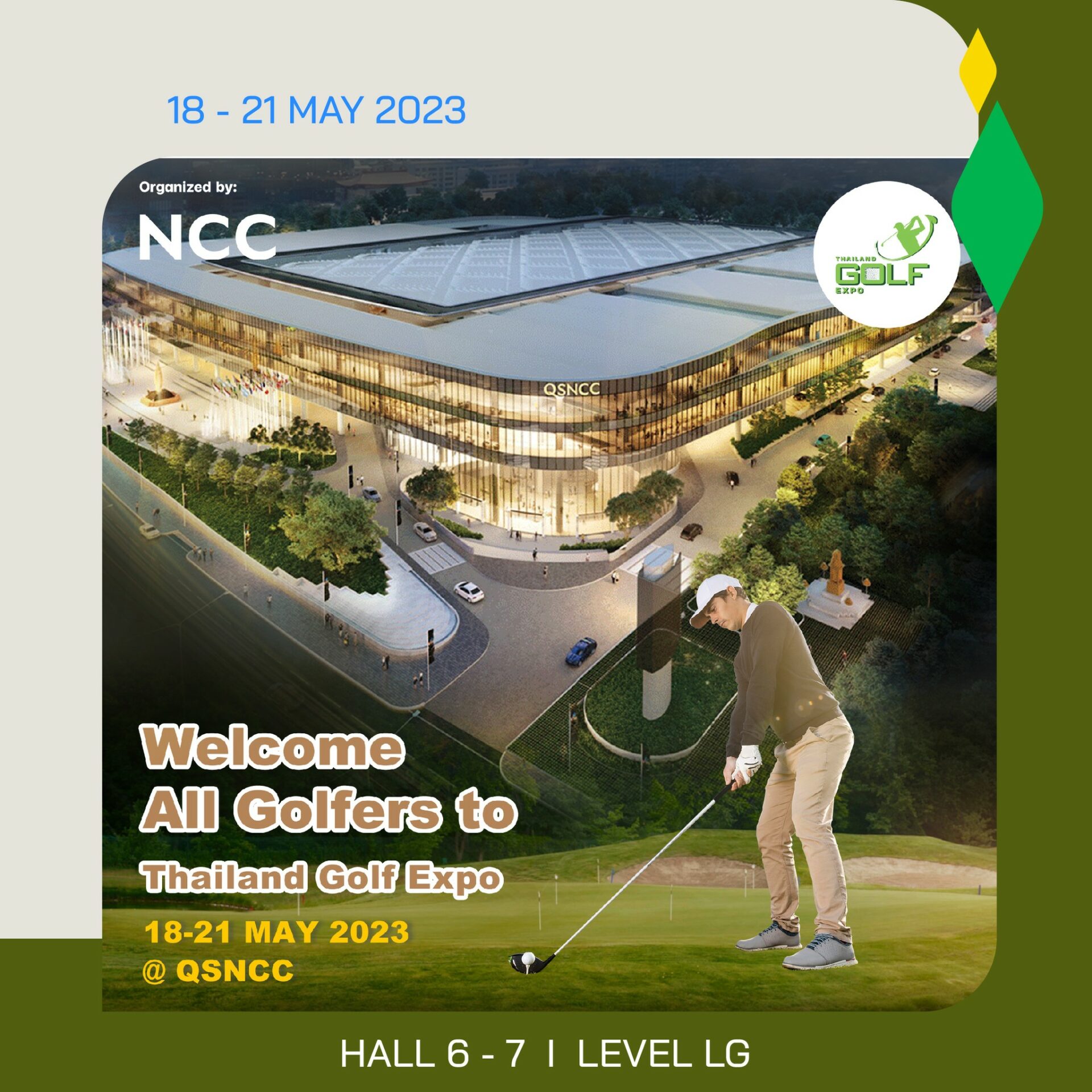 • Thailand Golf Expo 2023 เต็มอิ่มกับสินค้าและบริการเอาใจสายกอล์ฟ พบดีลพิเศษกับสเปเชียลแพ็คเกจที่ใช้ได้กับสนามกอล์ฟทั่วไทย สนุกกับกิจกรรมดวลฝีมือพัตต์กอล์ฟ เพื่อลุ้นรับรางวัลจำนวนมาก ระหว่างวันที่ 18-21 พฤษภาคม
