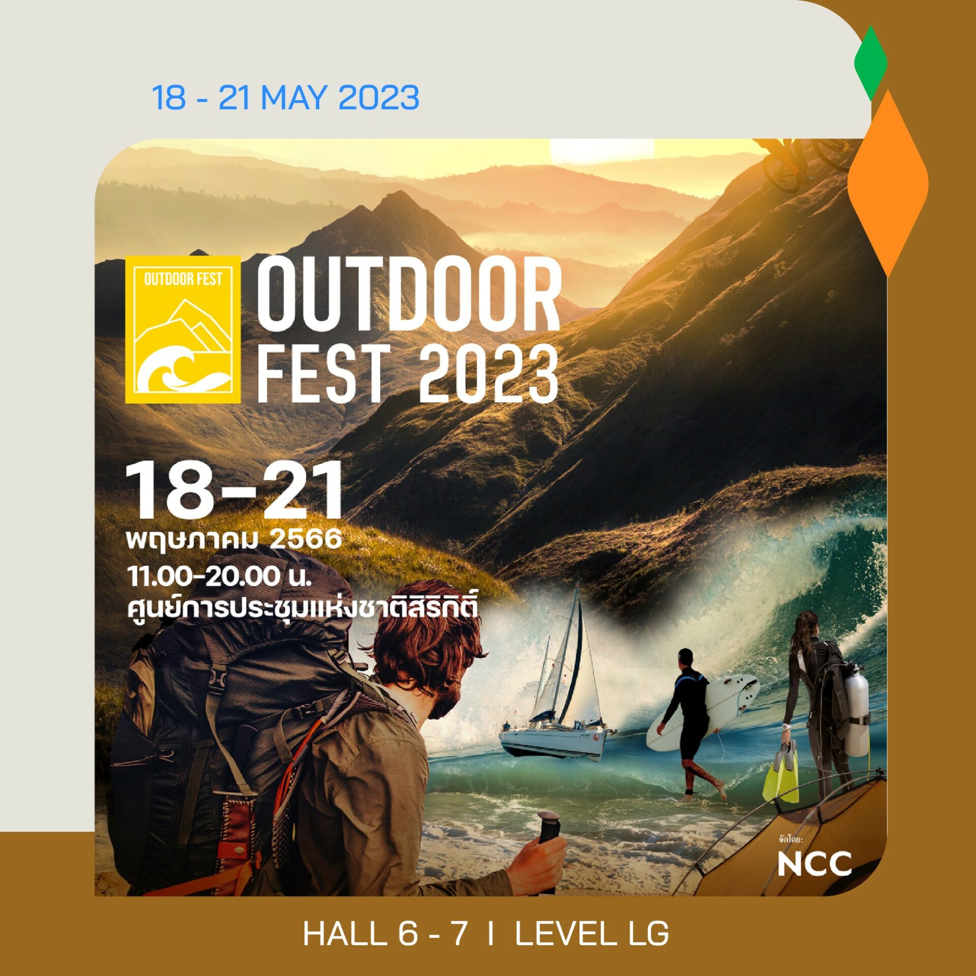 • Outdoor Fest 2023 จัดเต็มกับสินค้าและแอคทิวิตี้กลางแจ้ง ทั้งบนบก-น้ำ-อากาศที่มากที่สุด ตอบโจทย์สายเอาท์ดอร์และผู้ที่ชื่นชอบกีฬาเอ็กซ์ตรีม ระหว่างวันที่ 18-21 พฤษภาคม