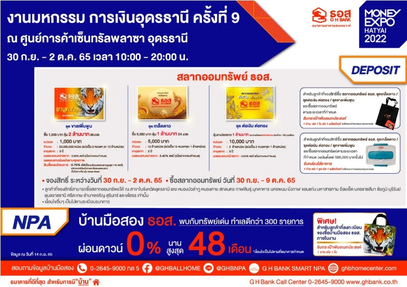 ทั้งนี้ ลูกค้าที่ใช้บริการผลิตภัณฑ์การเงินของ ธอส. ตามเงื่อนไขและระยะเวลาที่ธนาคารกำหนด จะได้รับของที่ระลึกฟรี!! อีกมากมาย โดย งาน Money Expo อุดรธานี ครั้งที่ 9 จะจัดขึ้นระหว่างวันที่ 30 กันยายน – 2 ตุลาคม 2565 ณ ศูนย์การค้าเซ็นทรัลพลาซา อุดรธานี สอบถามข้อมูลเพิ่มเติมได้ที่ G H Bank Call Center โทร. 0-2645-9000 หรือ Facebook Fanpage ธนาคารอาคารสงเคราะห์ หรือดูข้อมูลบ้านมือสอง ธอส. ได้ที่ www.ghbhomecenter.com และ Line Official Account : @ghbnpa