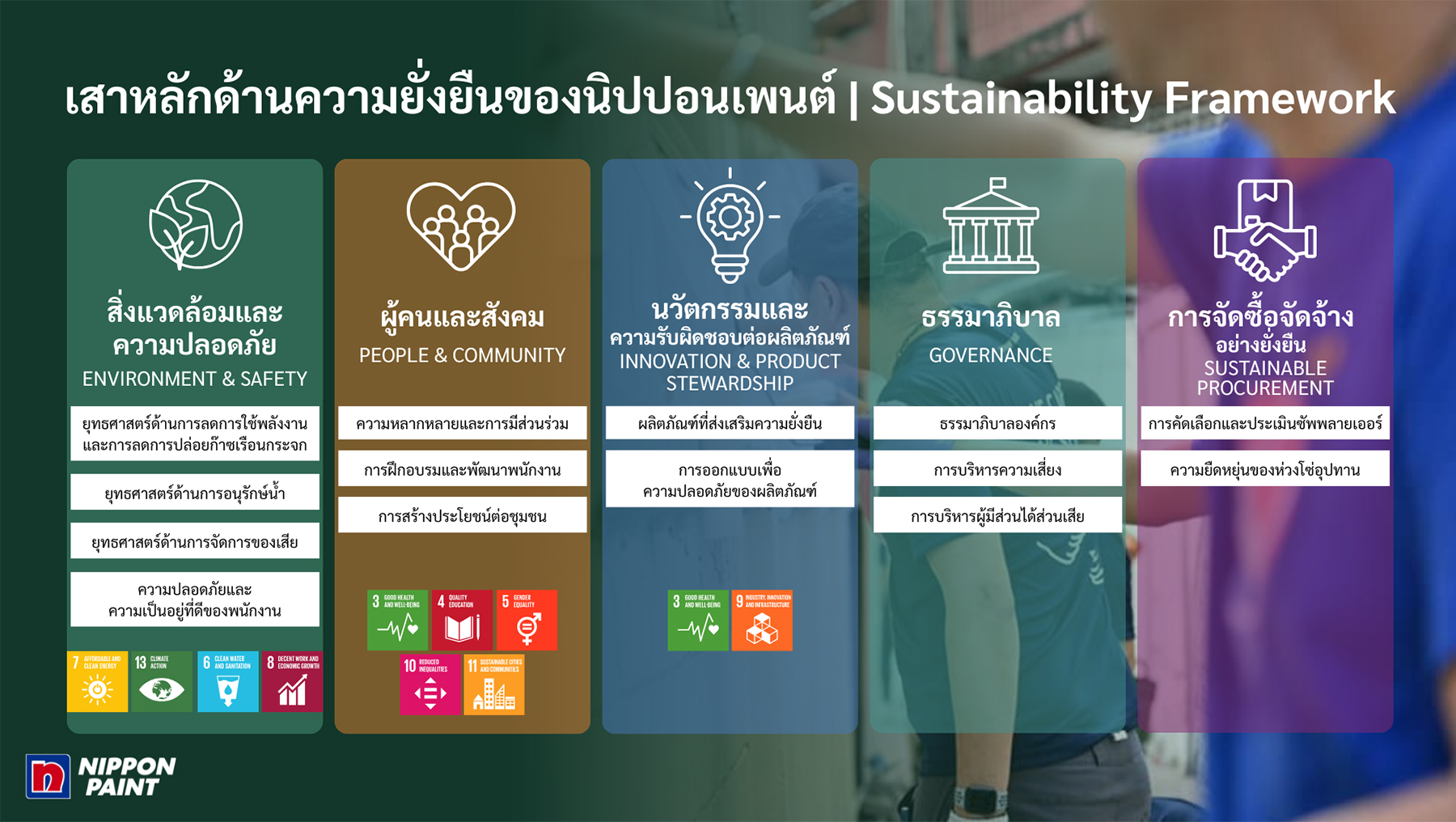 สำหรับ Sustainability Framework ของนิปปอนเพนต์ถือเป็นนโยบายระดับโลกที่ริเริ่มโดยบริษัทแม่ คือ NIPSEA Group ซึ่งมีการนำไปปฏิบัติจริงในหลากหลายประเทศทั่วโลกที่นิปปอนเพนต์มีฐานการผลิตรวมถึงประเทศไทย โดยแต่ละประเทศจะมีการรับแนวทางไปปรับใช้ให้เหมาะสมกับบริบทของแต่ละประเทศ ทั้งนี้ การวางนโยบาย Sustainability Framework มีการวางแผนให้สอดคล้องกับเป้าหมายการพัฒนาที่ยั่งยืนของสหประชาชาติ (UNSDGs) ถึง 10 ข้อ กลั่นกรองออกมาเป็น 5 เสาหลัก ด้านความยั่งยืนของนิปปอนเพนต์ ได้แก่ สิ่งแวดล้อมและความปลอดภัย, ผู้คนและสังคม, นวัตกรรมและความรับผิดชอบต่อผลิตภัณฑ์, ธรรมาภิบาล และ การจัดซื้อจัดจ้างอย่างยั่งยืน