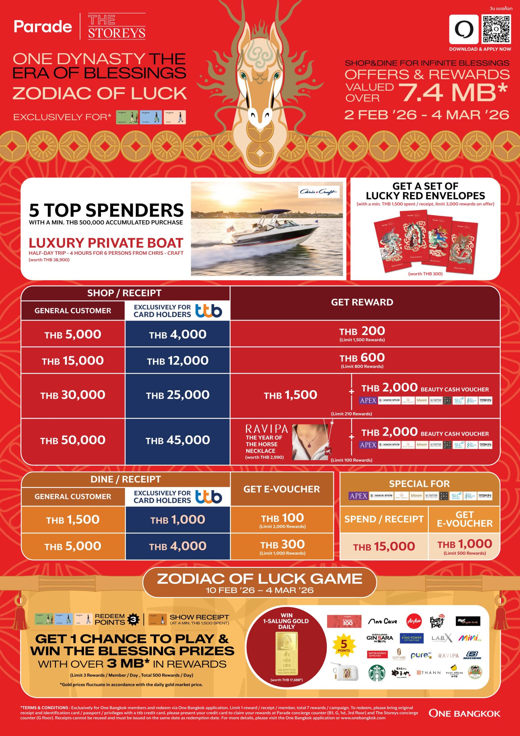 ร่วมเฉลิมฉลองเทศกาลตรุษจีน พร้อมสัมผัสประสบการณ์กิน – ช้อปสุดเอ็กซ์คลูซีฟ และเพลิดเพลินกับสิทธิประโยชน์มากมาย ได้แล้วที่ วัน แบงค็อก รีเทล ทั้งในโซน Parade และ The Storeys ตั้งแต่วันนี้ถึง 31 มีนาคม 2569 ดาวน์โหลดแอป วัน แบงค็อก บนมือถือเพื่อเข้าถึงสิทธิประโยชน์สุดเอ็กซ์คลูซีฟ รวมถึงอัปเดตข่าวสารและโปรโมชั่นพิเศษอีกมากมาย