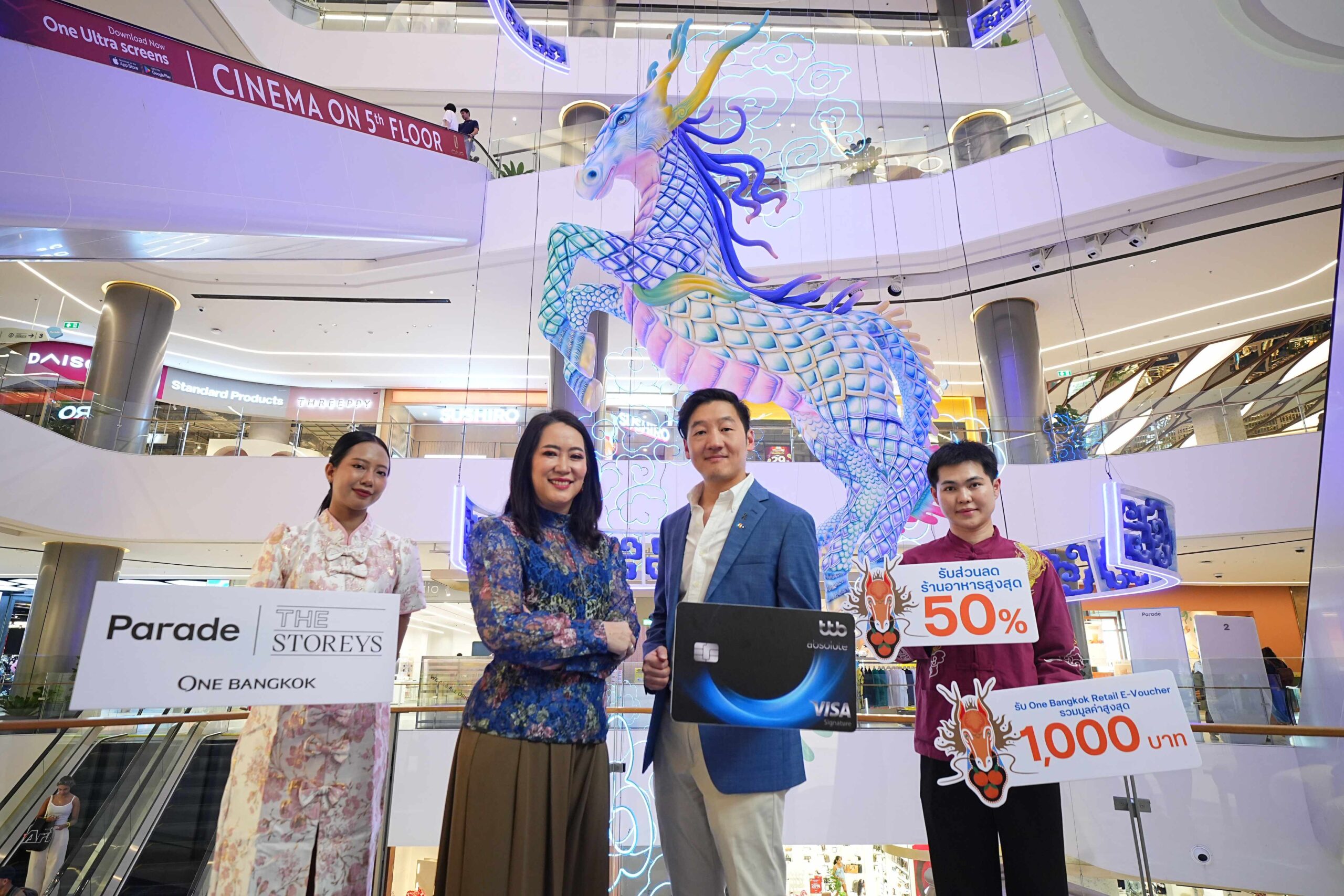 คุณพลินี คงชาญศิริ ประธานเจ้าหน้าที่บริหารฝ่ายรีเทล โครงการ วัน แบงค็อก กล่าวว่า “วัน แบงค็อก ร่วมปักหมุดเฉลิมฉลองการก้าวสู่ศักราชใหม่ :”ปีมะเมีย” ด้วยความเฮง กับเทศกาลตรุษจีนที่เปี่ยมด้วย สิริมงคล โดยผนึกกำลังกับพันธมิตรชั้นนำอย่าง ทีทีบี จัดแคมเปญ “ZODIAC OF LUCK” เพื่อมอบประสบการณ์ กิน – ช้อปสุดเอ็กซ์คลูซีฟในห้วงเวลาแห่งความสุขนี้ให้กับลูกค้าคนสำคัญผู้เป็นสมาชิก One Bangkok รับรางวัลรวมมูลค่ากว่า 7.4 ล้านบาท พร้อมมอบเอกสิทธิ์และสิทธิประโยชน์เหนือระดับไปอีกขั้น ให้กับผู้ใช้จ่ายผ่านบัตรเครดิต ttb ครบตามเงื่อนไข”