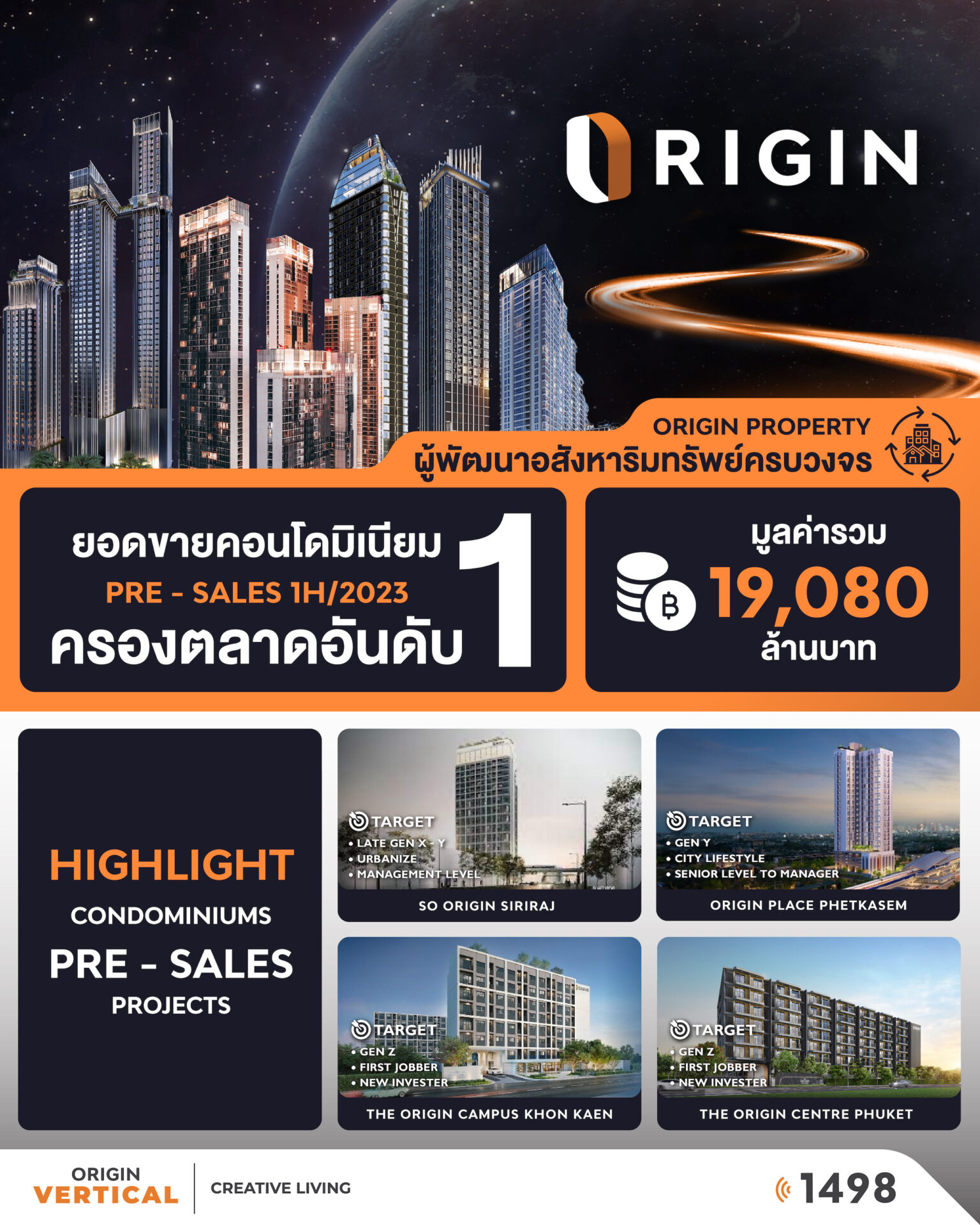 ตอกย้ำความแรงไม่มีหยุดของ “เจ้าตลาดคอนโด” เมืองไทย บริษัท ออริจิ้น พร็อพเพอร์ตี้ จำกัด (มหาชน) หรือ ORI ผู้พัฒนาธุรกิจอสังหาริมทรัพย์ครบวงจร ภายใต้การนำของแม่ทัพใหญ่ พีระพงศ์ จรูญเอก ที่ยังคงได้รับความไว้วางใจจากผู้บริโภค ล่าสุด สามารถกวาดยอดขายกลุ่มโครงการคอนโดมิเนียมครึ่งปีแรกของปี 2566 ได้ถึง 19,080 ล้านบาท สูงสุดเป็นอันดับ 1 ของตลาดอสังหาริมทรัพย์ประเภทคอนโดมิเนียมปีนี้
