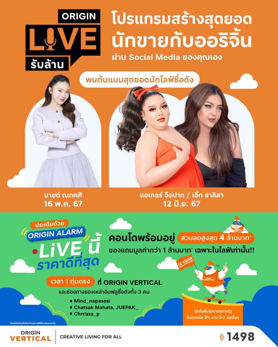 ORIGIN VERTICAL ในเครือออริจิ้น พร็อพเพอร์ตี้ ต่อยอดกลยุทธ์ Everyone Can Sell เปิดตัว Affiliate Program ภายใต้แคมเปญ “ORIGIN LIVE รับล้าน” เปิดทางครีเอเตอร์นักขายทั่วประเทศ ร่วมสร้างสรรค์คอนเทนท์คอนโด พร้อมรับค่าคอมมิชชั่นสูงสุด 1 ล้าน เปิดทางเข้าถึงกลุ่มลูกค้าใหม่ๆ และหลากหลาย รับสมัครถึง 31 ก.ค.นี้ พร้อมดึง 3 ครีเอเตอร์ตัวท็อป มายด์ ณภศศิ–เอแคลร์ จือปาก–เอิ้ก ชาลิสา โชว์สเต็ปสุดยอดนักขายผ่าน Live 16 พ.ค.นี้ ยกทัพ 15 คอนโด หลากเซ็กเมนท์ทั้งโครงการใหม่และพร้อมอยู่ มอบส่วนลดสูงสุด 4 ล้าน พร้อมของแถมสุดพิเศษเฉพาะในไลฟ์เท่านั้น