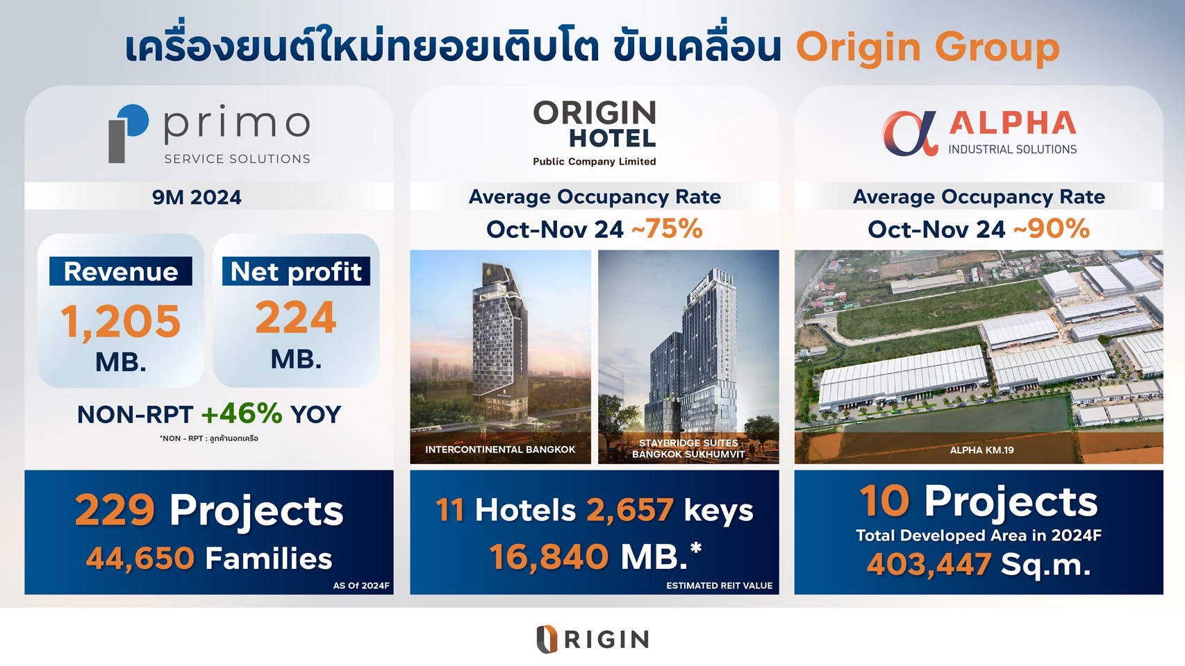 ออริจิ้น กางพอร์ต 3 กลุ่มธุรกิจใหม่ โรงแรม–คลังสินค้า–บริการ ขึ้นแท่น New S-Curve ขับเคลื่อนสร้างสมดุลการเติบโตอย่างยั่งยืน ครอบคลุมโรงแรมแบรนด์ดัง 11 แห่ง 2,657 ห้อง คลังสินค้าทำเลยุทธศาสตร์ขนส่ง 10 แห่ง และบริการอสังหาฯครบวงจรดูแล 44,650 ครอบครัว แย้มอัตราเข้าพักโรงแรมเดือน ต.ค.–พ.ย. ทะลุ 75% อัตราเช่าคลังสินค้าทะลุ 90% หลังตลาดเข้าช่วงไฮซีซั่นและฟรีวีซีซ่านักท่องเที่ยวเพิ่มขึ้น ด้านธุรกิจบริการอสังหาฯ ครบวงจร กวาดรายได้ 9 เดือนกว่า 1,205 ล้าน วางรากฐาน New S-Curve เติบโตยั่งยืน